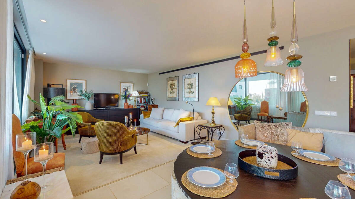 Living Room: Expansive and light-filled with floor-to-ceiling glass doors opening onto the terrace. Generous lounge and dining areas designed for refined entertaining and relaxed living.