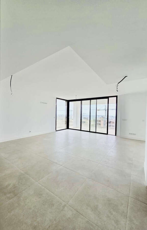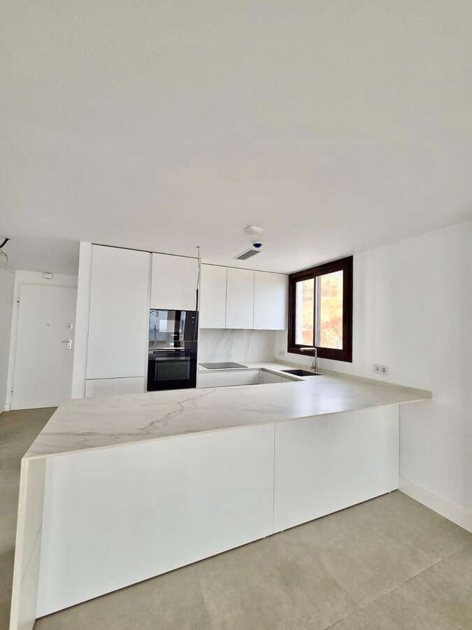 Originally designed as a three-bedroom apartment, the layout has been thoughtfully converted into a spacious two-bedroom home. This transformation has created a significantly larger living area, enhancing both the sense of openness and everyday comfort. The open-plan kitchen—equipped with premium Bosch appliances and high-quality finishes—flows seamlessly into the living space, which connects directly to the terrace through large glass openings.