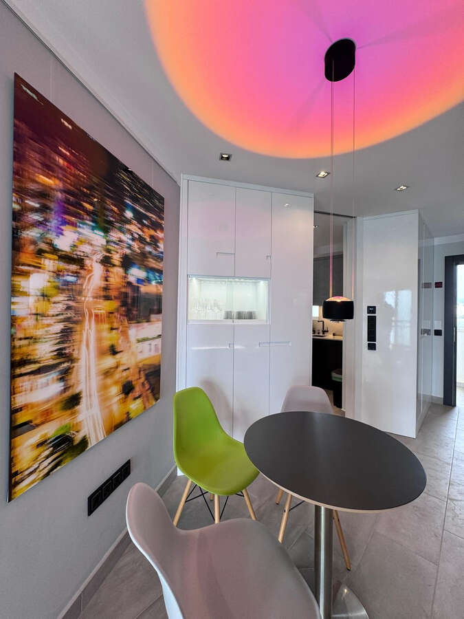 The apartment is well designed and includes air conditioning in both the living room and the bedroom, built-in wardrobes, and large sliding doors that provide direct access to the terrace from both spaces.