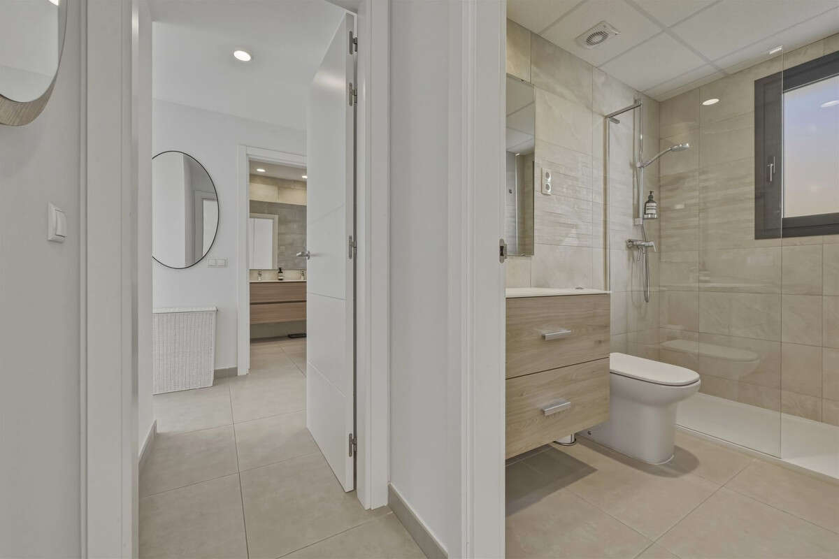 Bedrooms with Direct Terrace Access - The master suite enjoys direct access to the main terrace, allowing the panoramic golf views to be appreciated from both inside and out. The en-suite bathroom is spacious and contemporary, featuring a walk-in shower and double vanity. The second bedroom also benefits from direct terrace access and the same beautiful outlook, making it ideal for guests or family. A second modern bathroom with walk-in shower completes the accommodation.