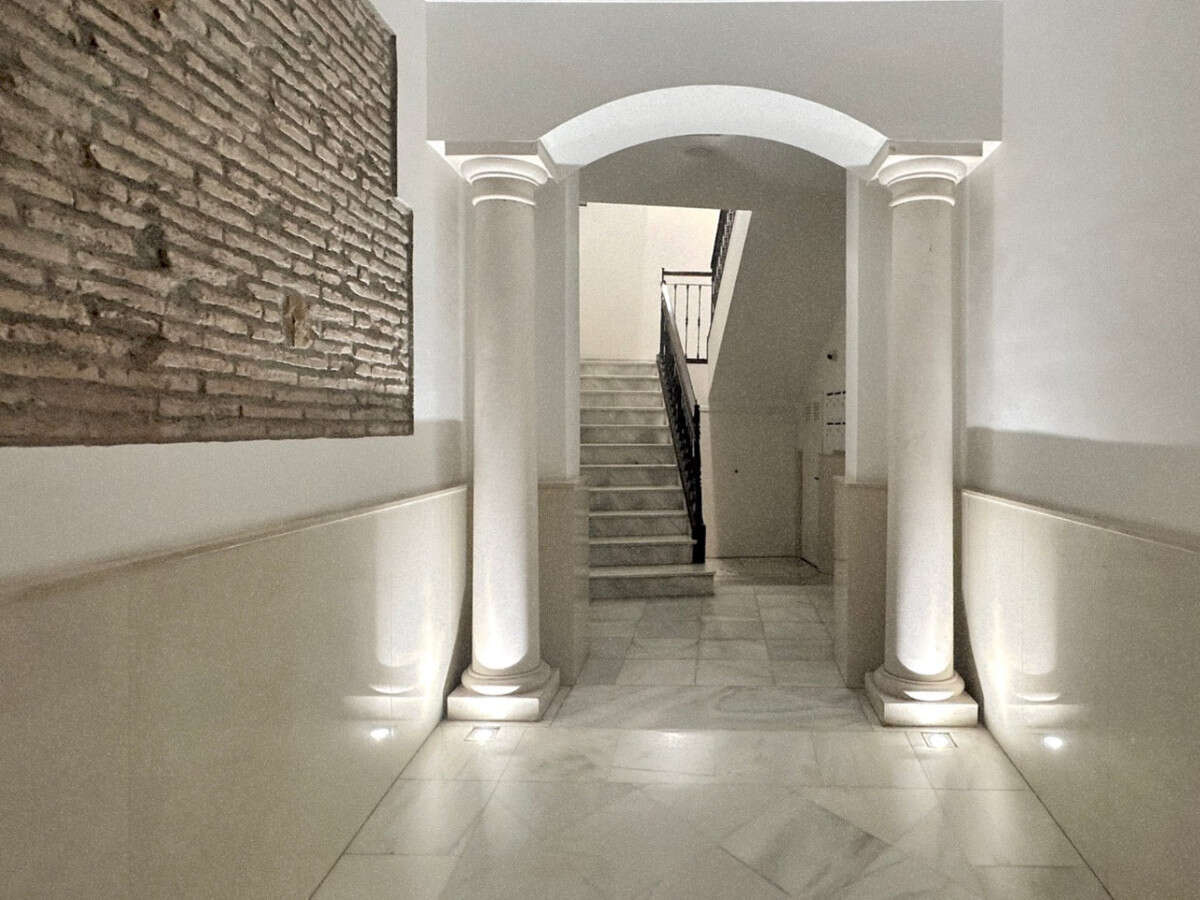 The building stands out for its façade with balconies and typical closures of local architecture, as well as its elegant entrance gate. Inside, original details have been preserved, such as the wrought iron railings and part of the old hydraulic flooring, while the panoramic stainless steel elevator adds a modern touch. From the communal rooftop terrace, residents can enjoy spectacular views of the Cathedral and the Gibralfaro Castle.