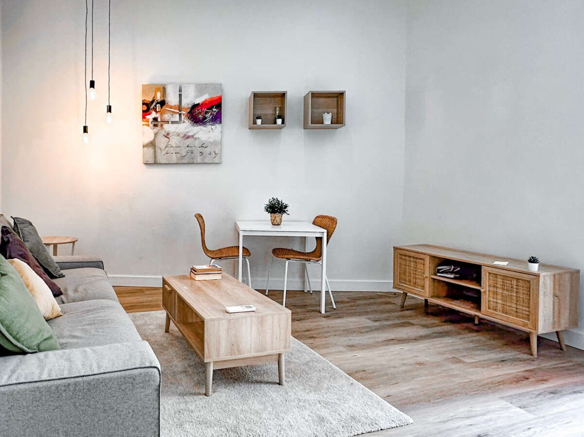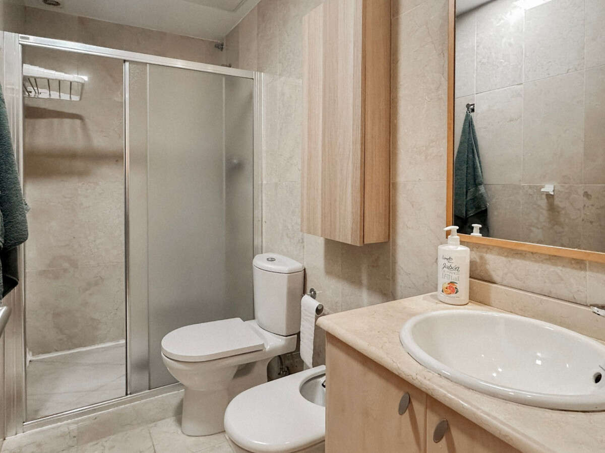The floors have been renovated with oak-effect laminates, the walls are smooth, and the false ceilings are made of plaster. The apartment is equipped with hot/cold air conditioning in both the living room and bedroom.