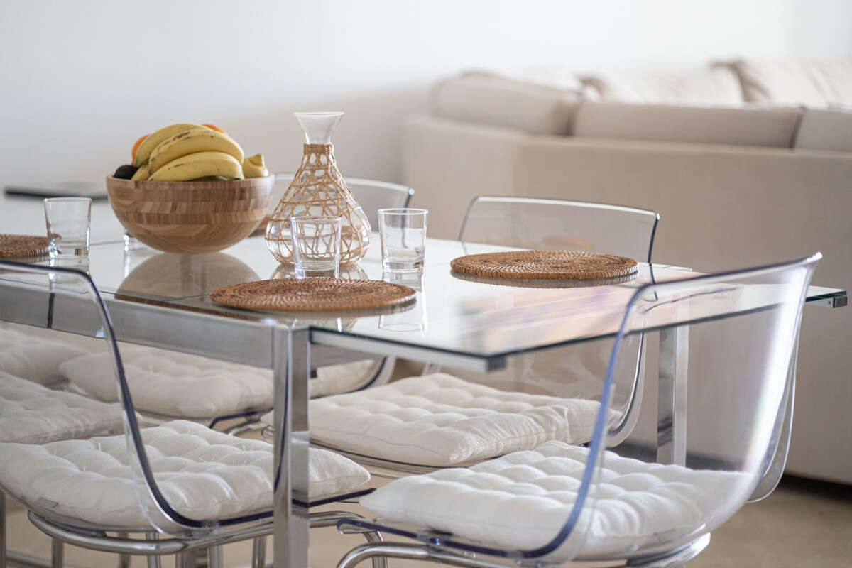 The apartment features a bright, open-plan living and dining area seamlessly connected with a fully equipped new kitchen. The living space opens up to a large covered terrace with extra dining table, perfect for al fresco meals, which extends into a lush, private garden with sun loungers and partial sea views.