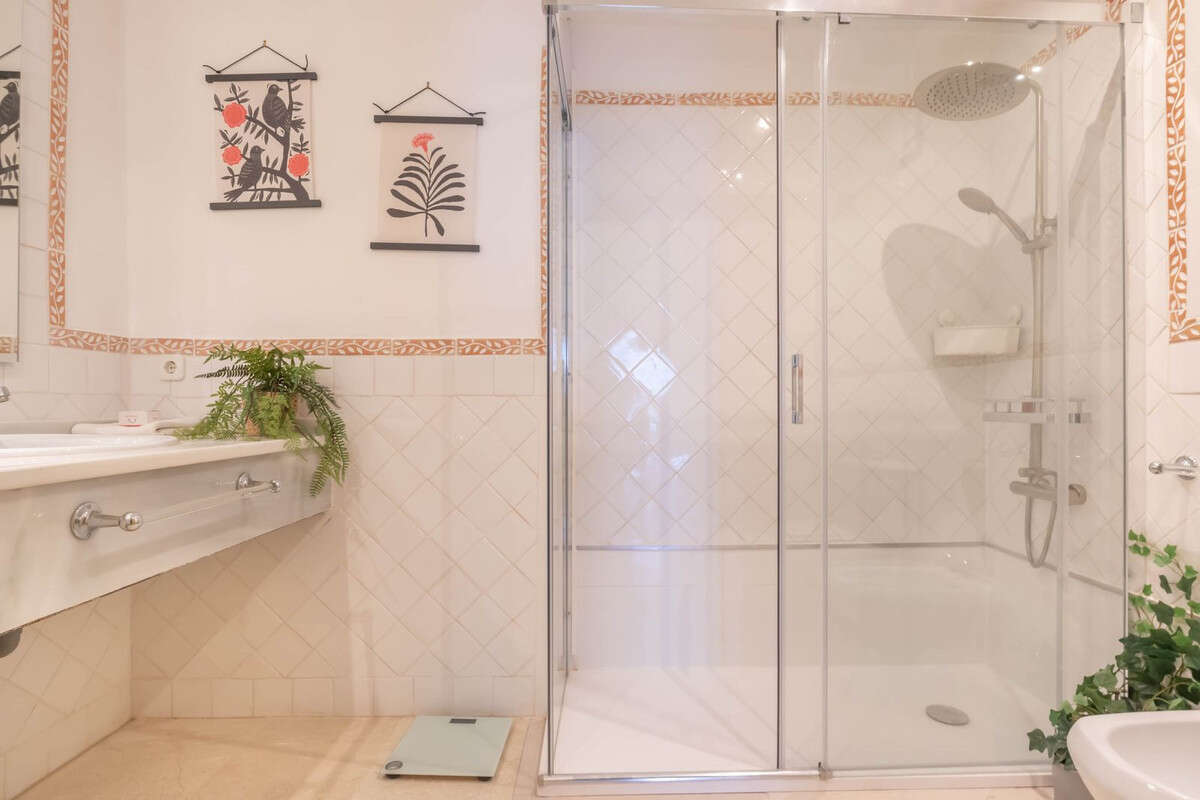 The property features two modern bathrooms: a main family bathroom and a guest bathroom with shower. Comfort is ensured year-round with air conditioning and a ceiling fan in the living area.