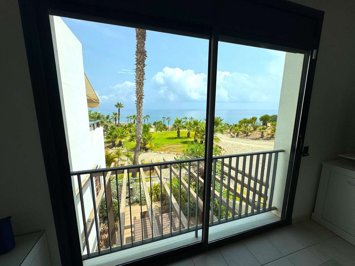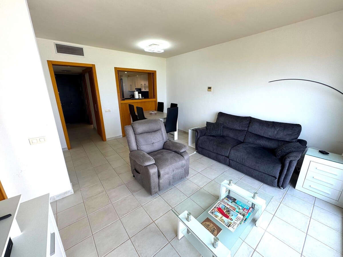 Inside, the spacious apartment opens into an inviting hallway with the fully fitted kitchen immediately to the left. The kitchen features ample storage, vibrant worktops, modern appliances, and an opening through to the bright and airy lounge and dining area. Floor to ceiling sliding doors frame incredible views over the resort, the coast, and the Mediterranean Sea.