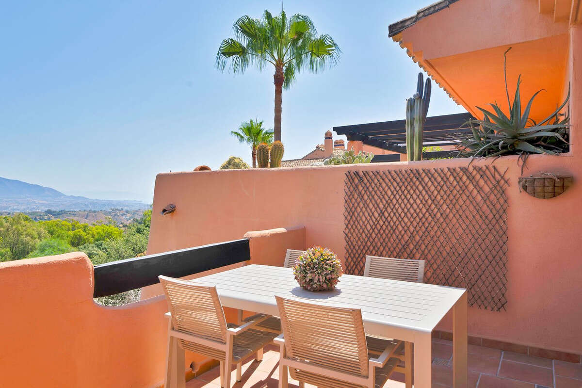 The duplex penthouse home has one of the best positions within what is a large and popular residential complex. Built on the undulating hillsides of upper Elviria, the community uses authentic Andalusian architecture to create a beautiful environment comprising of pretty paved walkways, Moorish-style water features and stunning Mediterranean gardens. The community is wonderful for those who wish to benefit from walking within the coasts natural landscape, with incredible views down through the valley of la Cala de Mijas to the sea and the impressive mountains leading all the way up the coast as far as Sierra Nevada. In the winter the snow on the peaks of the famous ski resort can be seen from the property.