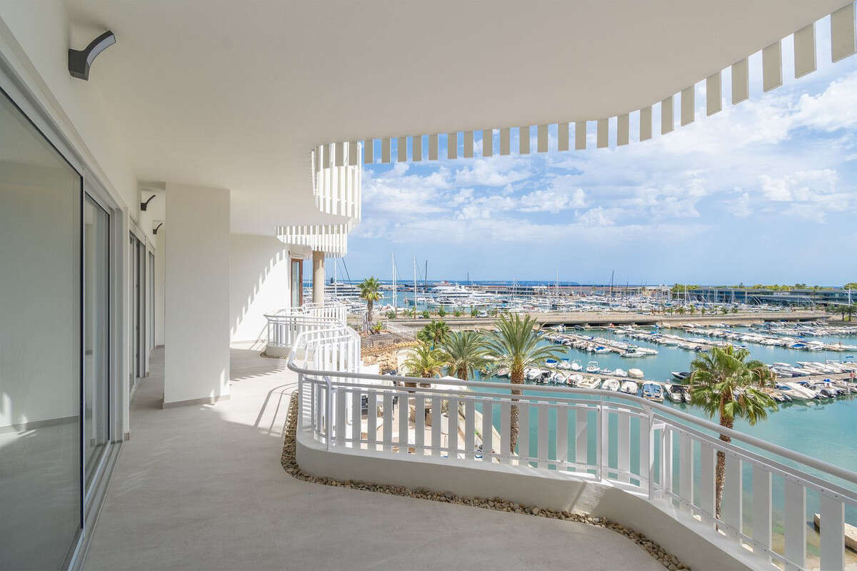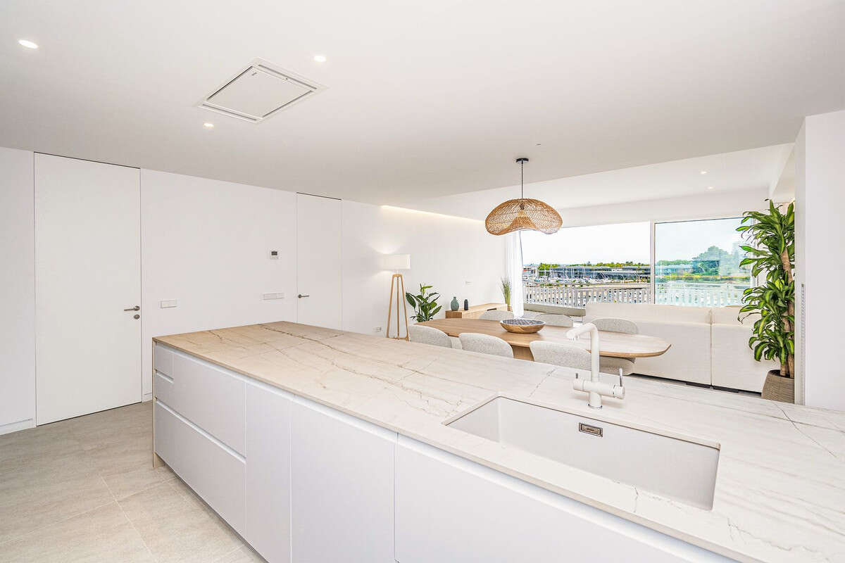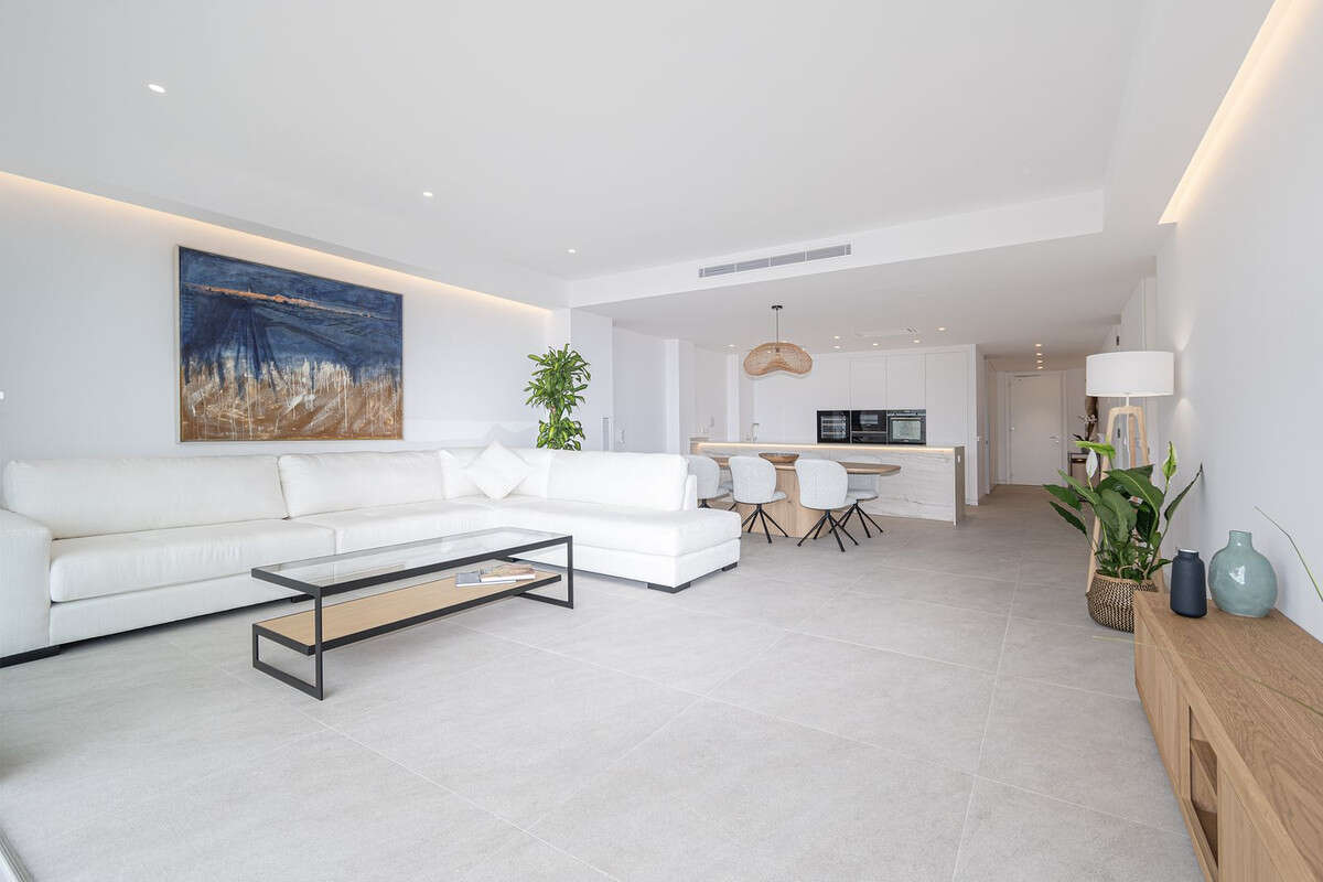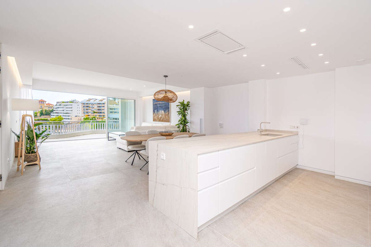 Beautiful apartment in Can Barbara Palma with views, large living room with open-plan kitchen of 60 m2, has 3 bedrooms, two with views and three bathrooms, one en suite, the kitchen is equipped with Siamens appliances and has invisible induction cooking surface, water softener and reverse osmosis system, the floors are large format 100x 100 porcelain, white lacquered interior carpentry with doors flush with the wall to the ceiling, with invisible hinges and magnetic lock, the skirting boards are invisible flush with the wall, the built-in wardrobes, lined and with lighting, the toilets and bathroom furniture are suspended, PVC exterior carpentry with motorized blinds, double glazing with 4 + 4.2 low-emissivity glass, gas chamber and solar control. Air conditioning and production of domestic hot water by high-performance Aerotermia system, the air conditioning is through ducts and the mechanical ventilation system It also has a terrace and porch, and garage service is included in the price.