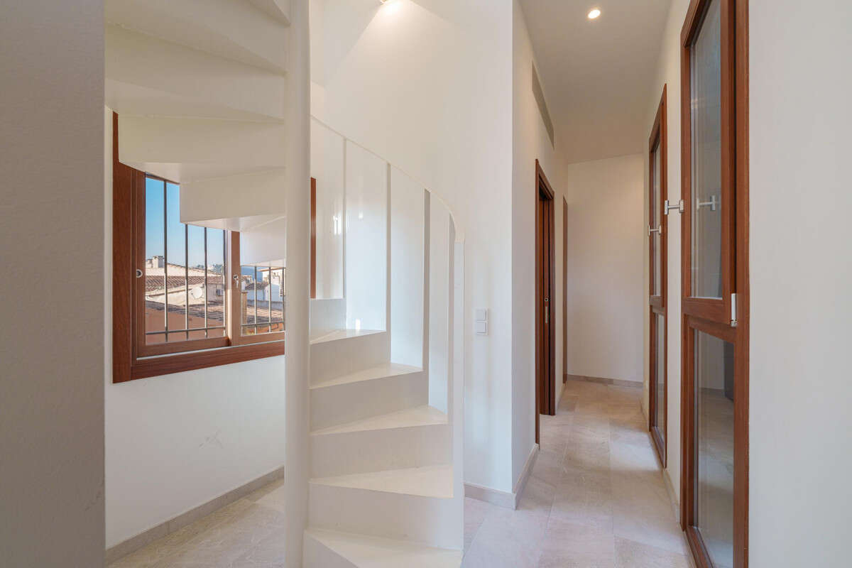 A true highlight of the property is the upper level, accessed via an elegant spiral staircase. Here, you will find an impressive private rooftop terrace with an adjoining enclosed space, ideal for creating a summer kitchen or additional lounge area. From this elevated position, the panoramic views extend across the rooftops of the Old Town to the cathedral, Santa Eulalia Church, Bellver Castle, the Mediterranean Sea, and the surrounding mountains, creating a truly unique outlook. The spacious terrace provides the perfect setting for sunbathing, entertaining guests, or enjoying warm Mediterranean evenings under the open sky.