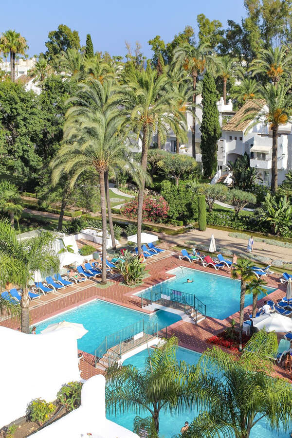 Very exclusive duplex penthouse, South facing, consisting in 3 bedrooms, 2 bathrooms, fully fitted kitchen and large lounge and dining area with access to a very nice terrace overlooking the fantastic gardens and pool area of the complex. On the upper floor we find an enormous master bedroom with en suit bathroom, large walking wardrobe and office. We also find another very large terrace with bar. garage and storeroom are included.