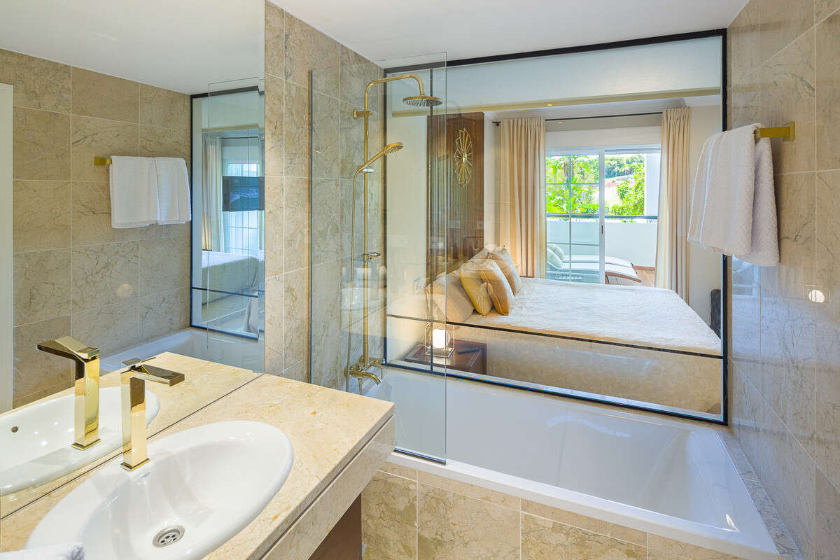Newly renovated Luxury design, cozy apartment in prestigious Marbella Golden Mile urbanization "Balcon de Puente Romano", next to "Puente Romano Nobu", "Marbella Club", the beach and sea - 3-5 min walking distance. Bright and spacious apartment with a brand-new furniture and top-quality equipment, 2 modern bedrooms, 2 bathrooms, 2 big terraces, HD TV in each room, air conditioner with 3 different climate zones, 24 h access to newly renovated swimming pool. For your comfort and luxury living in tropic garden surround. Private underground parking is included.