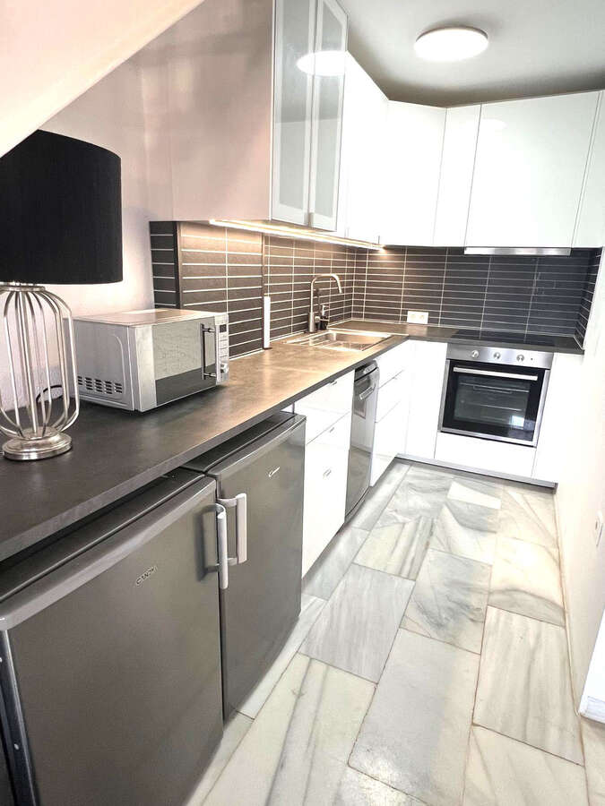 The property is distributed over two levels and has been recently refurbished to high standards. The main floor features a bright, double-height living-dining area with a sleek open-plan kitchen, one bedroom, and a full bathroom. The upper level offers a charming attic-style second bedroom and an additional bathroom.