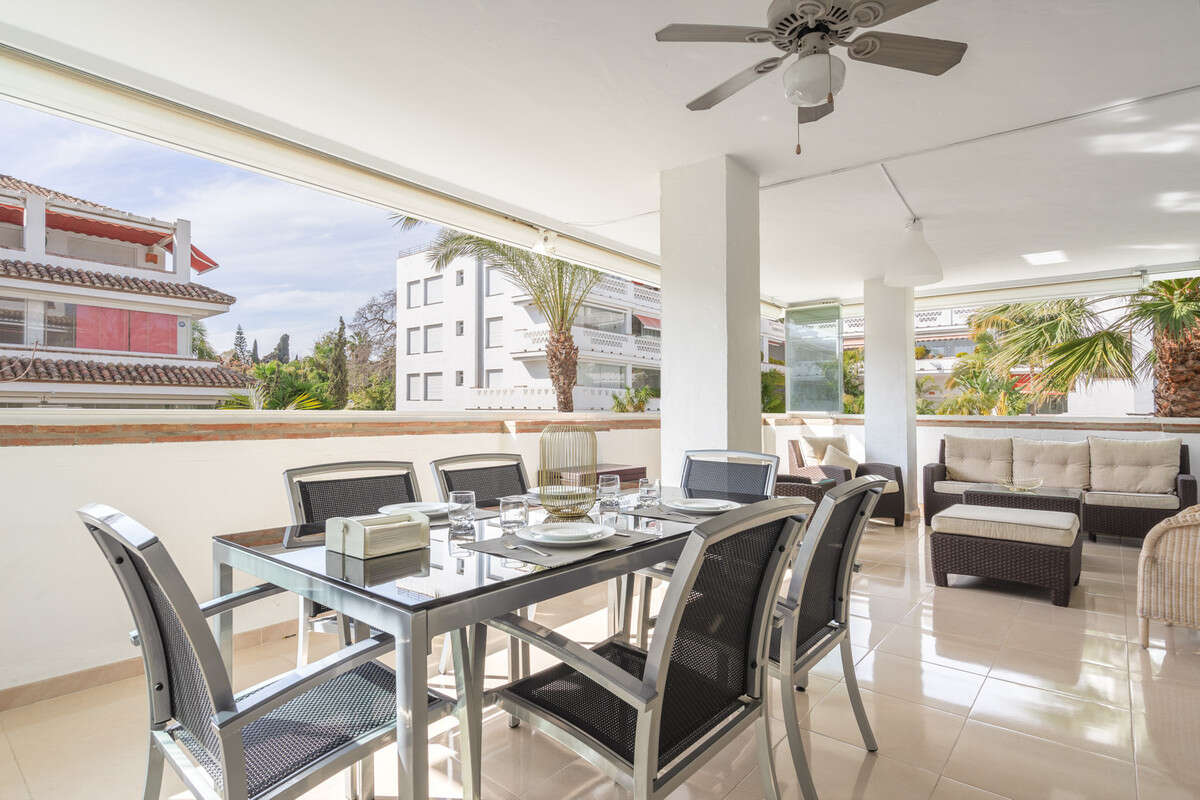 Excellent three bedroom, first floor apartment on Marbella's Golden Mile, in the sought after frontline beach community Las Cañas Beach, with 24hr security service, several communal swimming pools and tropical gardens. As well as being only a short walk to many bars, shops and restaurants. Casablanca Beach, one of the best on the coast, is just outside the front door. The apartment has a spacious open plan living and dining area with French doors leading out to the private terrace which is enclosed with glass curtians; fully fitted kitchen; master suite with access to the terrace; two guest bedrooms and a guest bathroom. Other features include hot and cold air conditioning, fitted wardrobes and underground parking space.