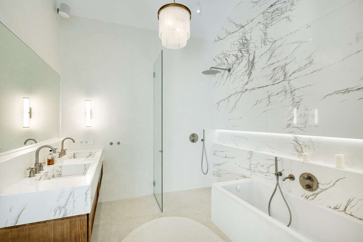 Located in the sought-after area of the Marbella Golden Mile, Costa PH is an exceptional duplex penthouse offering panoramic sea and mountain views. Designed with a modern open-plan layout, the living, dining, and kitchen areas are seamlessly connected, creating a bright and spacious environment. The state-of-the-art kitchen features a striking marble island, elegant wooden cabinetry, and integrated high-end appliances, with a stylish wine rack adding to the aesthetics.