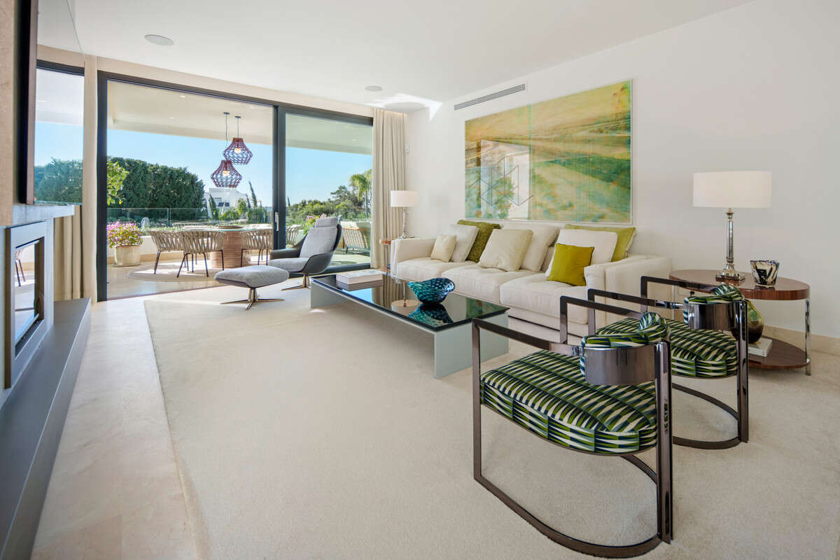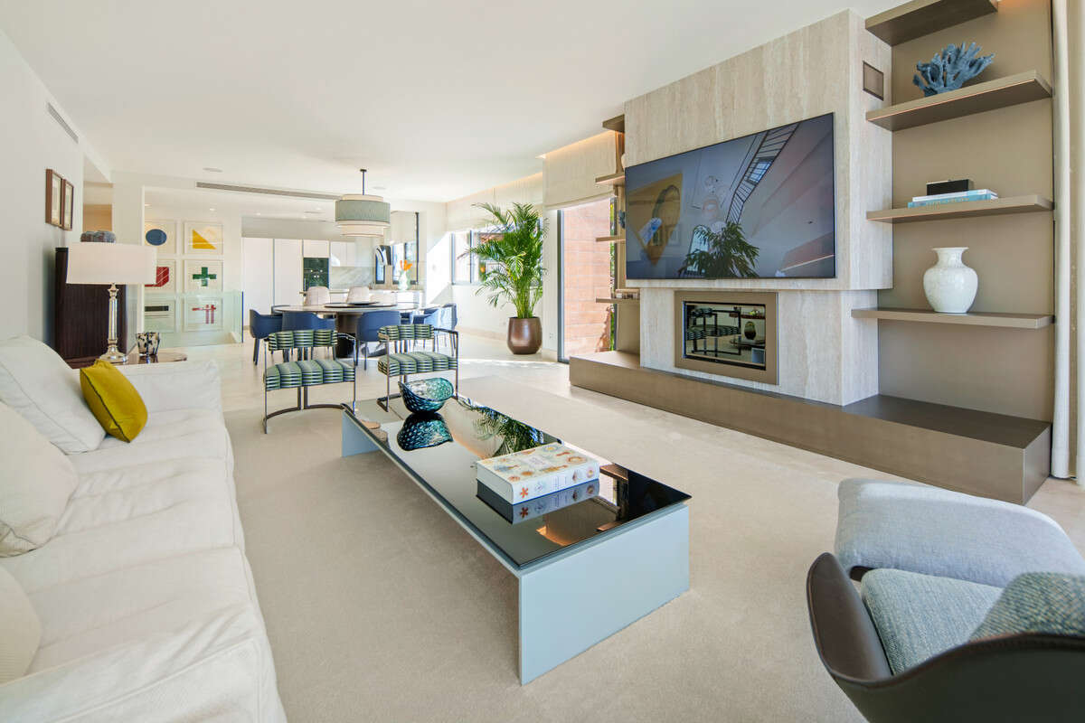 Atlas is a duplex ground-floor apartment in Reserva de Sierra Blanca offering four bedrooms, four bathrooms plus a guest cloakroom, arranged over a discreet entertainment level below and a calm main living floor above, with interiors by Pedro Peña, bespoke carpentry by Vaneva, technical installations by Proinsermant, climate systems by Technoclima, and a private terrace with garden and pool outlook, plus two internally accessed parking spaces.