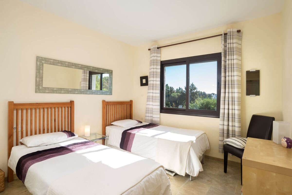 The spacious master bedroom features an en-suite bathroom with a bathtub, ample wardrobes, and room for a double bed and a desk. The second bedroom offers excellent space for two single beds and a large, elegant en-suite bathroom. There is also a separate guest toilet.
