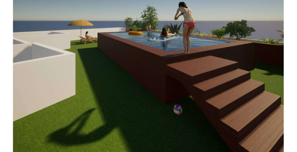 The solarium / roof terrace can also be reached by elevator or stairs and there you will find the communal swimming pool.