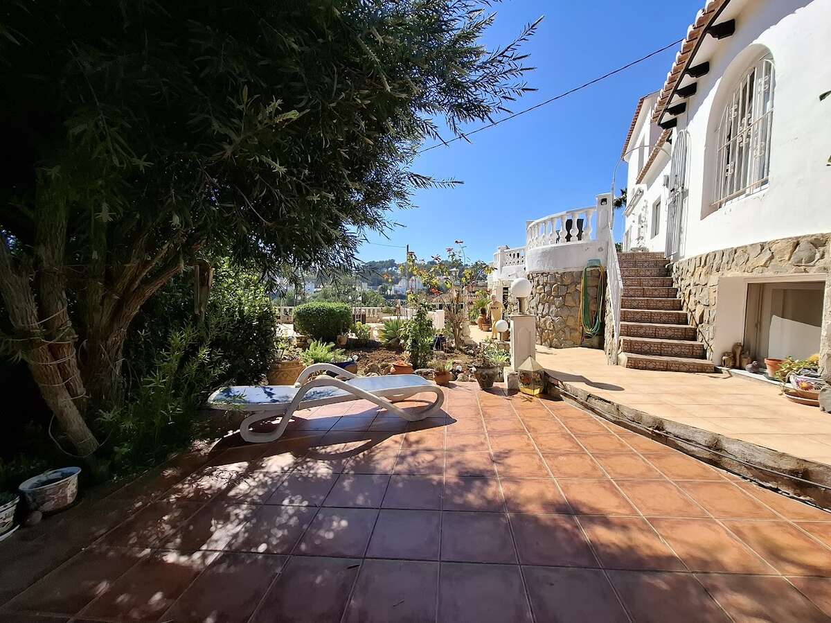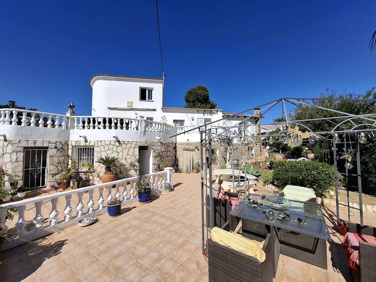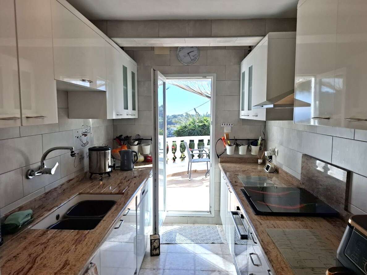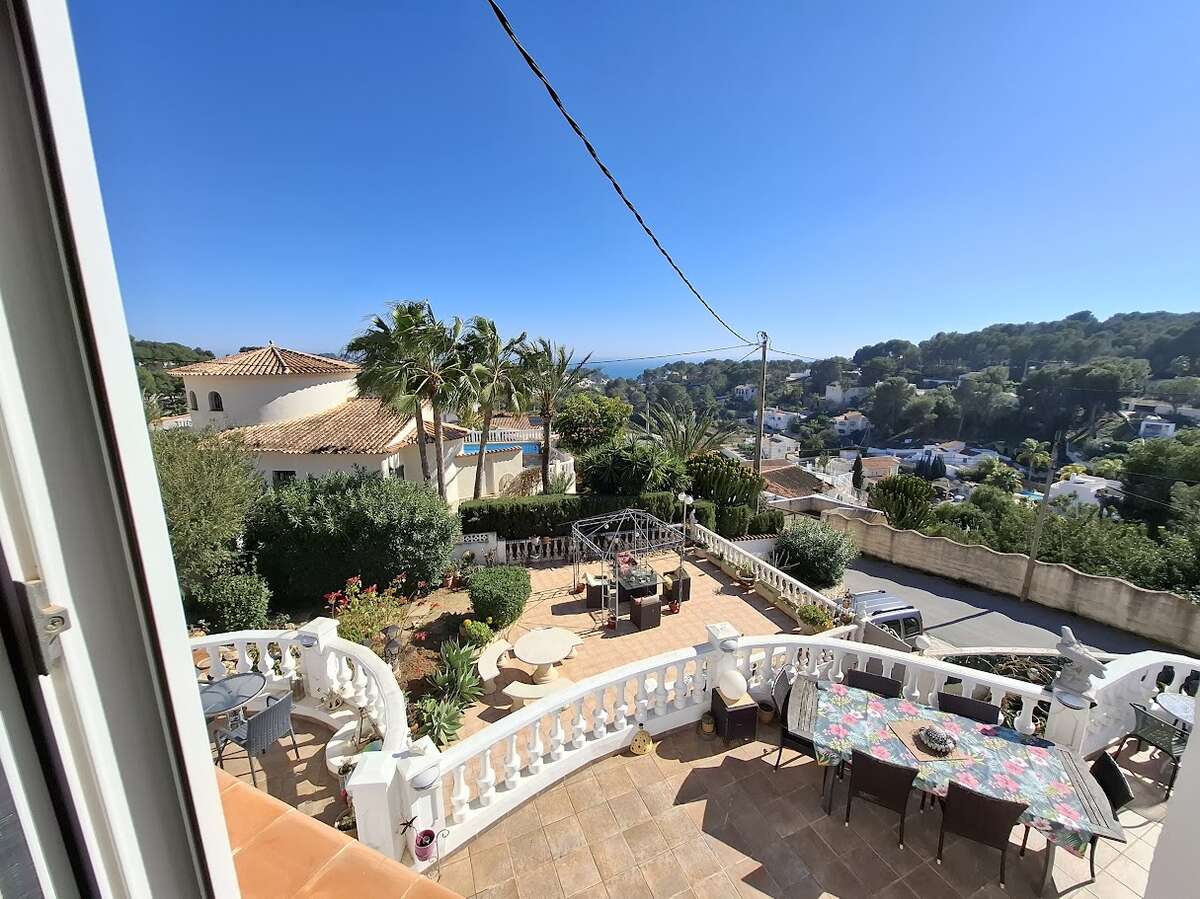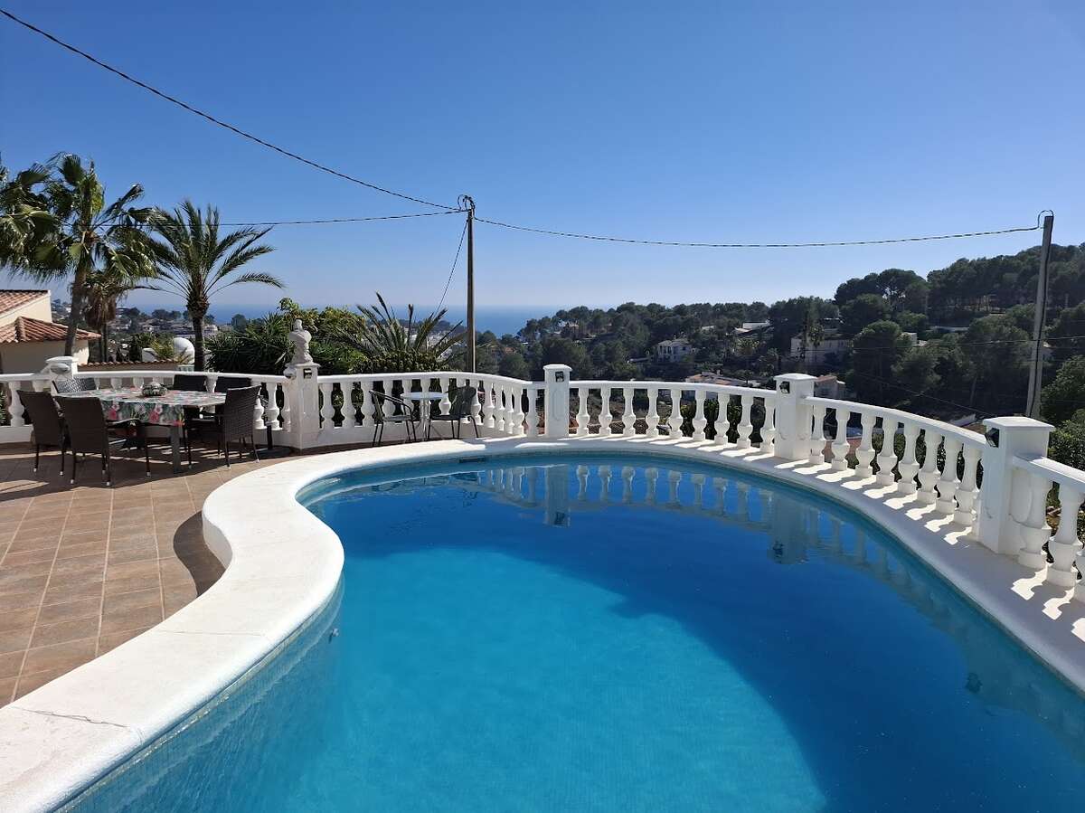 Villa with pool and sea views in Benissa. The main floor features a spacious and bright living-dining room, a fully equipped independent kitchen, four bedrooms, and three bathrooms. There is also a comfortable guest apartment with a living room, bedroom, and large bathroom. The villa includes gas central heating, a fireplace, a storage room, and a garage. Outside, there is a swimming pool, terrace, a lovely garden, and parking.