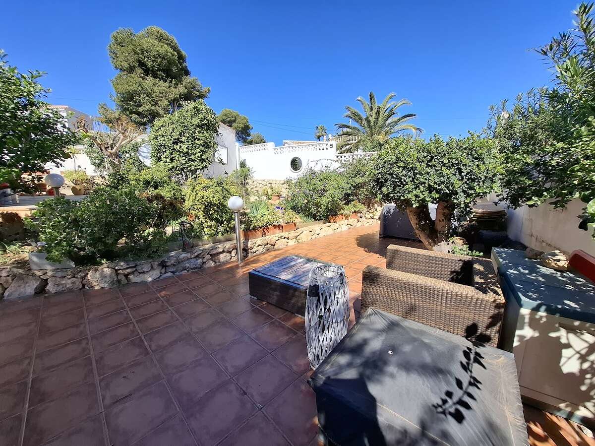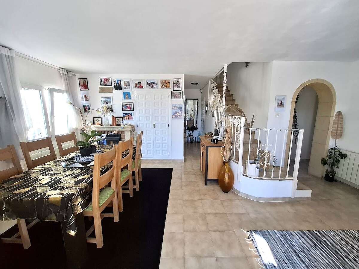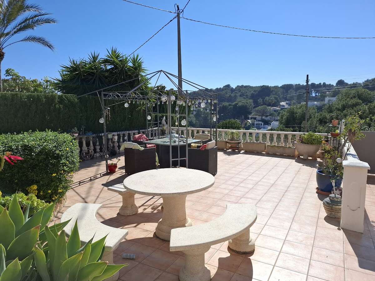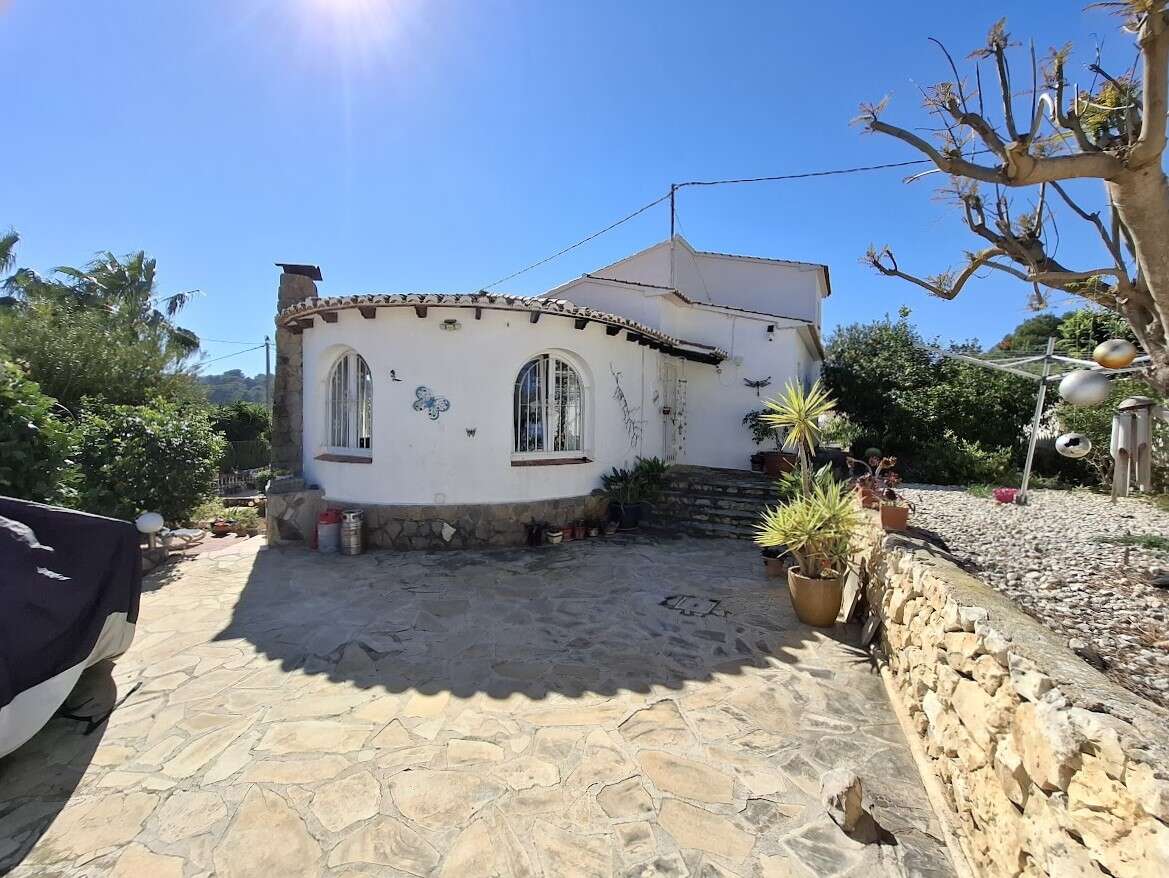 Villa with pool and sea views in Benissa. The main floor features a spacious and bright living-dining room, a fully equipped independent kitchen, four bedrooms, and three bathrooms. There is also a comfortable guest apartment with a living room, bedroom, and large bathroom. The villa includes gas central heating, a fireplace, a storage room, and a garage. Outside, there is a swimming pool, terrace, a lovely garden, and parking.
