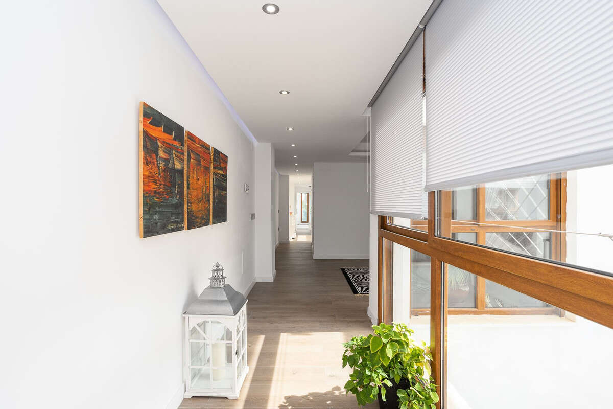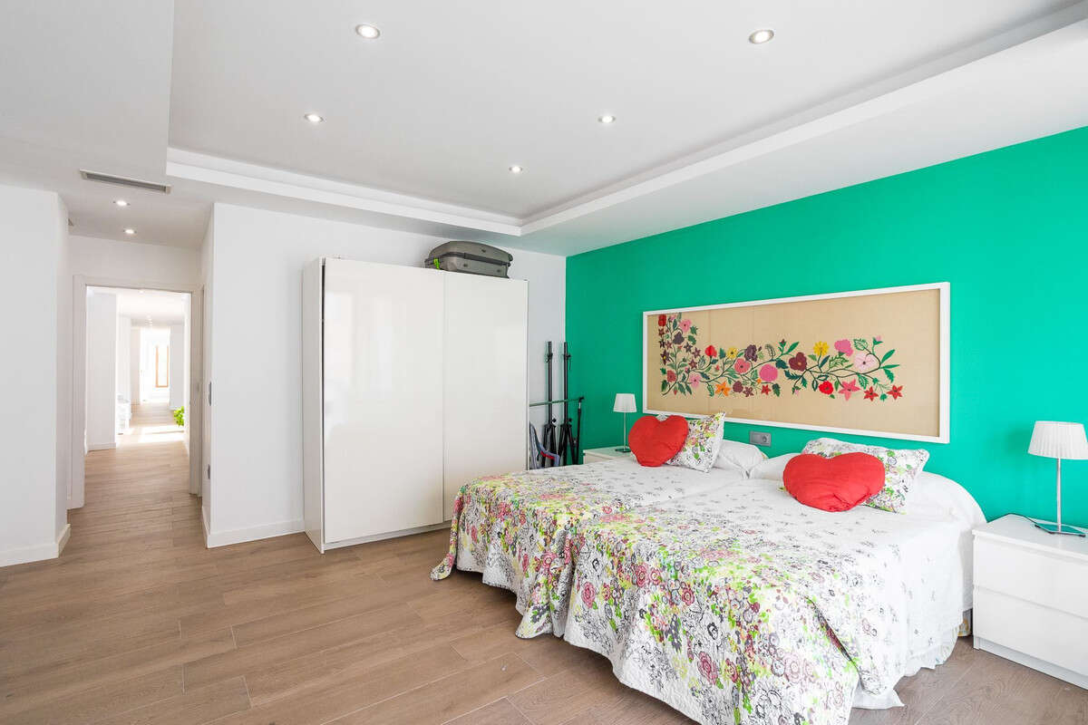 This modern villa here is about 509 square meters and has seven bedrooms, seven bathrooms, living room and kitchen. Added to this is a large terrace and a nice balcony, both with unbeatable views.