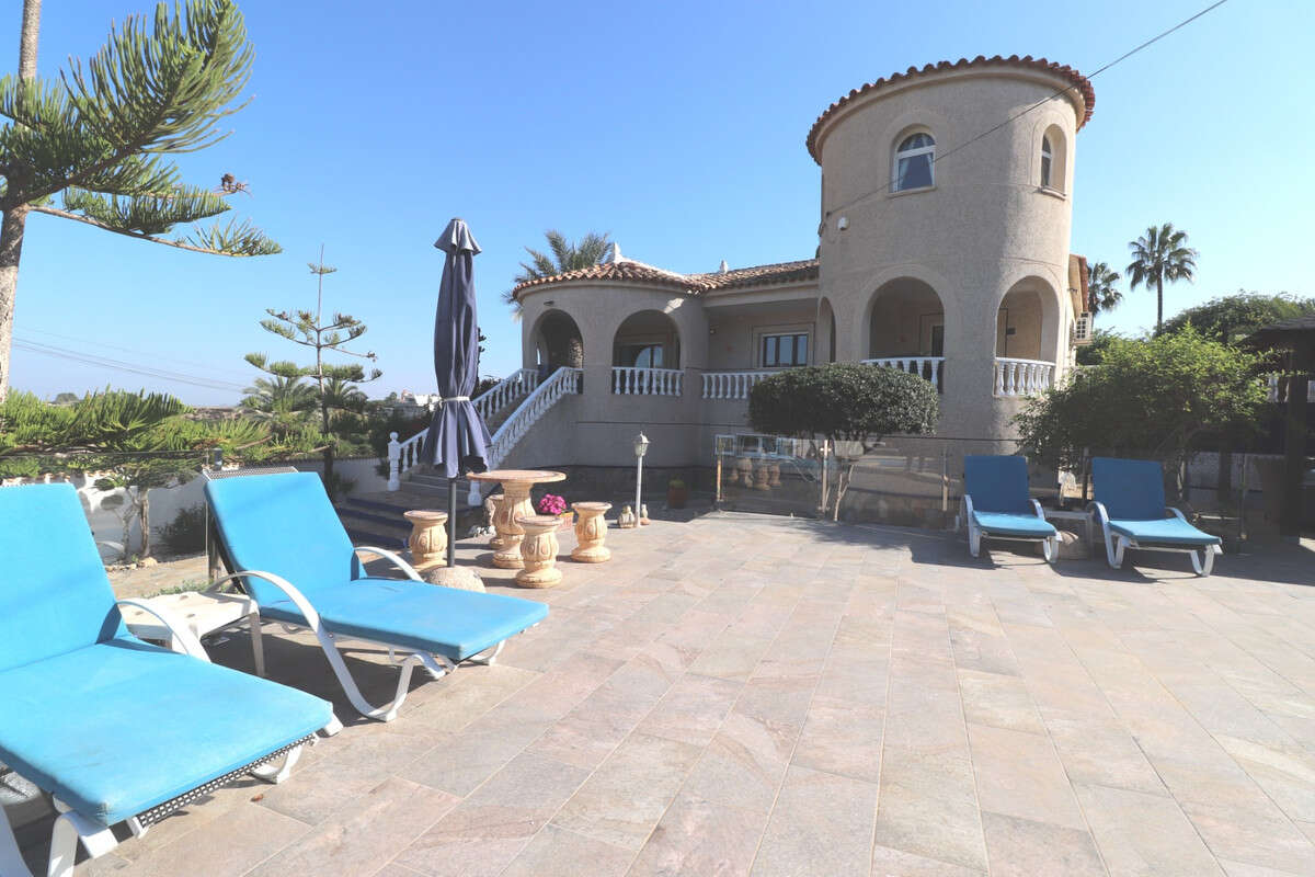 This Remarkable, West Facing, Corner, Five Bedroom Detached Villa in Lomas de La Juliana is located in a prominent position on the Costa Blanca South, under the area of Almoradi but closer to and conveniently situated between Algorfa village and the prestigious La Finca Golf, Hotel & Spa Resort. With a tennis club just at the top of the road and main brand amenities only a few minutes' drive away, the blue flag beaches of Guardamar del Segura are also just 15 minutes away! This incredible property spans an impressive 375m² build size on a stunning 1,149m² plot, offering panoramic views of the countryside, citrus groves, mountains, and sunsets. The main villa has been fully updated and modernized, retaining its character and charm, and includes three bedrooms and three bathrooms. Upon entering, the hallway leads to an open-plan, fully fitted kitchen with a breakfast bar, a spacious family-sized living room with a cozy log-burning fireplace, and direct access to the large front covered terrace, perfect for appreciating the breathtaking views. There's also a dining room with rear garden access, a shower room, and two bedrooms on the ground floor, one with an en-suite bath and shower. The upper-level master bedroom features a walk-through wardrobe, dressing table, and an en-suite shower room. The separate annex, located in the under-build, provides two additional bedrooms and a bathroom, accessed via the double garage or independently from the rear. This space includes a separate kitchen and dining area, a large bedroom with a living area and office, plus an en-suite shower. The garage is currently used as a games room with a pool table, ping pong, utility space, and an adjoining storeroom. Outside, the gravelled and tiled garden features an updated private swimming pool, a BBQ area, a small putting green, and ample space for outdoor dining and entertaining. Additional highlights include a carport, off-road parking, oil central heating, air conditioning throughout, ceiling fans, fitted wardrobes in the main villa, and dual entrances from different roads. This is an extraordinary opportunity to own a substantial and versatile property with fantastic views in an enviable location!