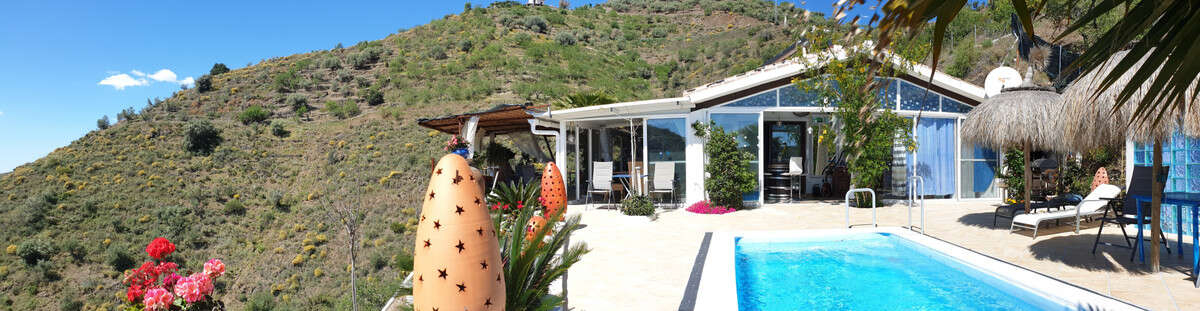 You are looking for a large villa with a heated swimming pool, neatly hidden nearly at the top of a mountain, surrounded by nature with breath-taking views of the valley up to the sea and the village of Arenas? This might just be what you are looking for. At the entry of the property, you find a covered parking space for at least 6 cars and a workshop. From there you step onto a wide porch that surrounds the whole property. In the centre of the house, that ́s all on one level, you find an office, 3 bedrooms, 2 bathrooms (one on-suite), 2 kitchens, an open bbq space, a large sitting/dining room and more sitting areas with views to the outside through French doors. Around the porch there is an array of different privative sitting/sunbathing spaces where it is just a dream to be. Here you also find the heated swimming pool, palm trees, an exterior bedroom and a passage leading to little romantic benches with fantastic views all around the foot of the property. There is also an outdoor kitchen. This property is well finished and comes with all the amenities. It is perfect for people that are fond of comfort and privacy. We are pleased to be able to present this dream property to you soon, either personally or via virtual viewing. Because this world, it is unique - just like our Axarquía. In Andalusia. On the Costa del Sol. Here, on the sunny side of life...