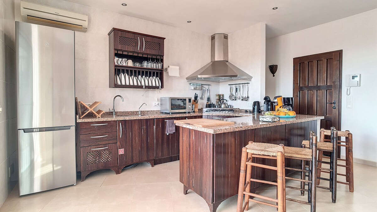 The villa offers a living room (sitting and dining area) with open-plan kitchen. On the ground floor, the villa offers 2 spacious bedrooms, each with a private bathroom, and a storage room with a washing machine and linen storage. A beautiful staircase in the lounge takes you to the first floor that offers you a full private room, a spacious bedroom with a lounge and relaxation area, an ensuite bathroom with bathtub/shower and a dressing room to say hello. The terrace has breathtaking views of the surrounding mountains and the sea.