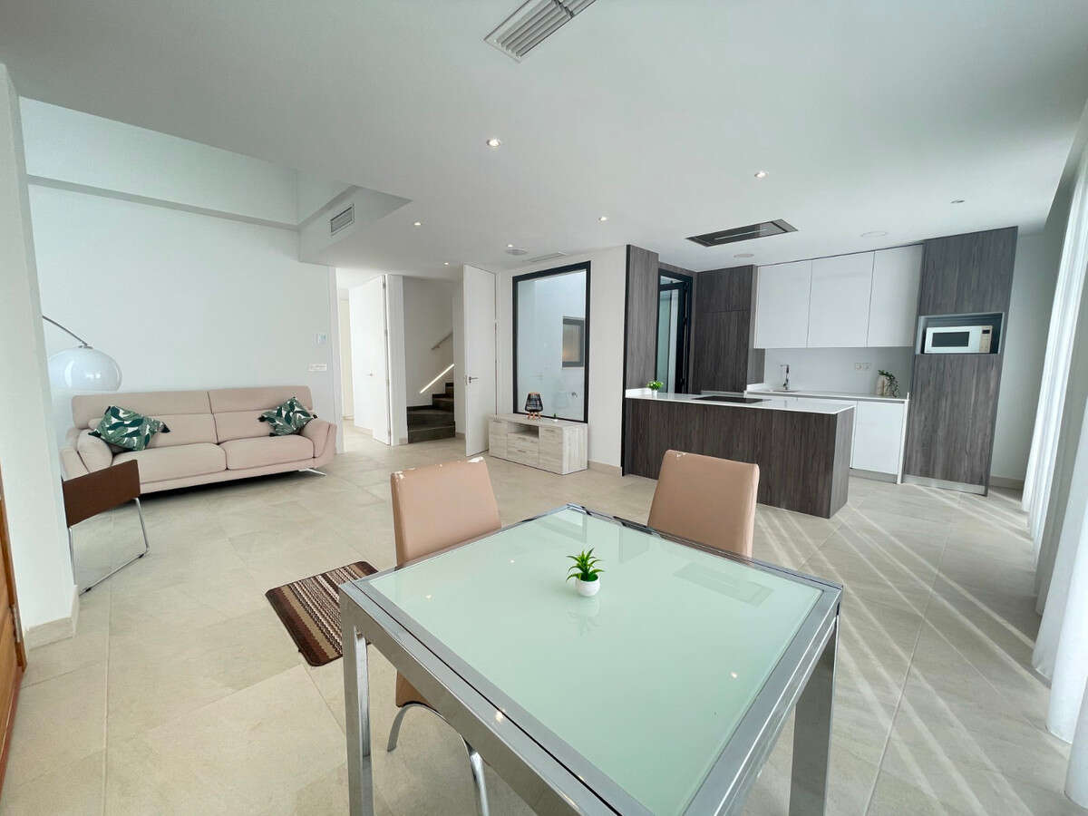 This spectacular independent villa, with 3 bedrooms and 3 bathrooms, is located in the charming town of Benijófar. Recently built, it is in perfect condition and ready to move in.On the main floor, the property features a master bedroom with an en-suite bathroom including a shower and two built-in wardrobes. There is also an additional guest toilet, a fully equipped kitchen with access to the laundry area, and a spacious living room with views of the exterior.Climbing elegant stairs with LED lighting, you reach the first floor, where there are two double bedrooms and a large bathroom with a shower. This floor also provides access to the terrace and solarium, offering stunning panoramic views of the mountains and surrounding countryside.The property includes a private pool, on-plot parking, and a basement ( not finish ) ideal for a wine cellar or storage room.Located just a few steps from the center of Benijófar, this villa is set in a charming area with all necessary services, making it perfect for year-round living or an ideal vacation retreat.