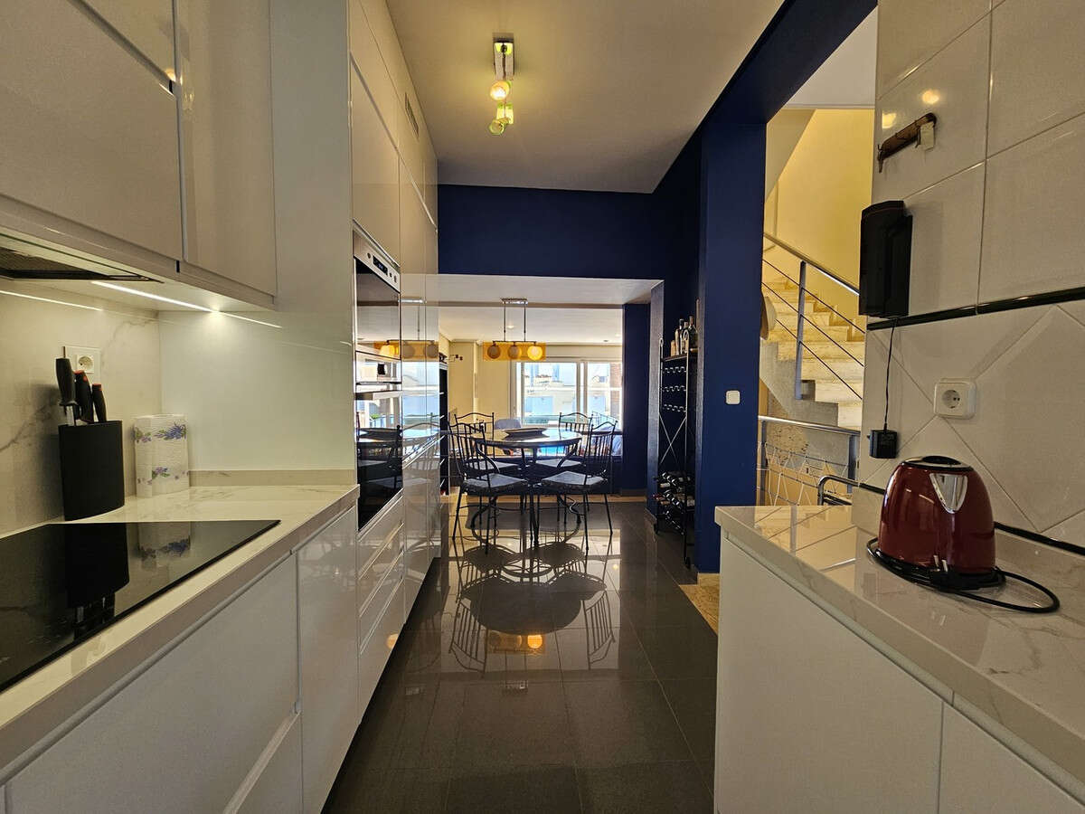 Rare opportunity to purchase this spectacular property in Calas de Campoamor with open sea views, just 100m from the beach. This 3 bedroom, 3 bathroom villa boasts a heated saline swimming pool installed less than 2 years ago along with a private solarium and underground garage and storage room. Located in a gated complex this property has been maintained to a very high standard with a sleek brand new kitchen and very attractive marble flooring throughout. On the ground floor there is fantastic living and dining room with floor to ceiling patio doors leading outside the the tiled terrace and swimming pool which has been finished with artificial grass. On the first floor you with find the master bedroom that enjoys sea views and en-suite bathroom along with two double guest bedrooms and the family bathroom all with views towards the sea or the communal swimming pool. On the top floor you will find the fabulous solarium with more stunning views of the Mediterranean and down towards the Mar Menor. The villa has an underground garage and storage accessed via an internal staircase, where you can conveniently access your car and exit the complex via electric doors. The house forms part of a well maintained complex where home owners also have use of the huge communal swimming pool and pretty garden. The property is sold as seen, fully furnished with many, many extras including independent laundry room, new air-conditioning units in the bedrooms, brand new kitchen appliances, non-chemical saline heated pool system, automated garage doors, intercom entry system, open fireplace in the living room and purpose built barbecue on the main terrace.
