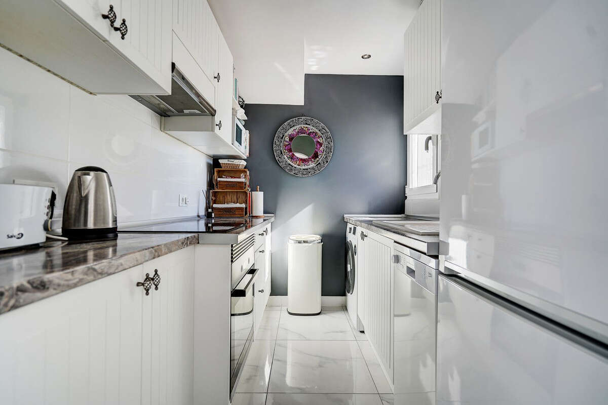 The interior layout is bright and modern. The lounge and dining area has large windows that bring in natural light and look out toward the sea, along with an electric fireplace for cooler months. The modern kitchen comes fully fitted with appliances and features a serving window that opens directly onto the terrace, which is especially useful when dining outside. There are two double bedrooms with hot and cold air conditioning, plus a full bathroom with a bathtub. All windows are double glazed and fitted with mosquito nets.