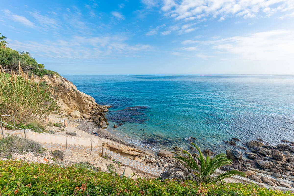 Nestled on the front line of the Northern Costa Blanca, in the highly sought-after residential area of Coveta Fuma, this exceptional villa spans over 220 square meters and sits on a particularly private plot more than five times its size. Positioned between two idyllic coves and on top of a third, it is just a short drive from the charming fishing village of Villajoyosa to the north and the picturesque coastal town of El Campello to the south. This privileged location offers breathtaking sea and mountain views, along with a private staircase leading directly to a secluded beach cove.