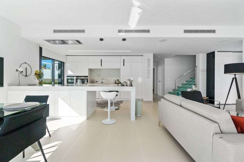 Magnificent luxury villa located in Dehesa de Campoamor just 300 m from the beach. Built on a 500 m2 plot, it has a constructed area of 200 m2. Distributed on two floors: on the ground floor we find the large living-dining room, open-plan kitchen, 2 bedrooms, 2 bathrooms, porch. On the first floor there is one more room, bathroom, half-covered solarium with jacuzzi and relaxation area. Views of the sea and surroundings from the solarium. Equipped with underfloor heating, central air conditioning installed, parking on the plot. Private heated saltwater pool. Southeast orientation. Sold furnished and equipped. It has a perfect location: 50 m from a supermarket, pharmacy, 200 m from a wide variety of bars and restaurants, promenade and the beaches of Campoamor 300 m away.