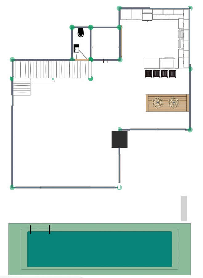 - Infinity pool with reinforced concrete, turquoise natural stone, and a compensation tank.