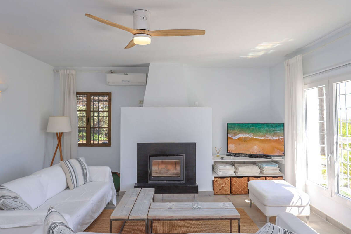 Inside, the villa feels refreshingly cool and inviting. The lounge centers around a striking fireplace, adding a cozy touch for winter evenings. The open-plan kitchen seamlessly connects to the living area and extends out to a covered dining terrace, perfectly positioned to overlook the pool.
