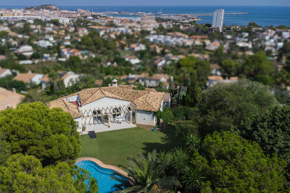 A light-filled detached villa with a private pool and a plot of over 2,000 m2, in one of the most exclusive areas of Dénia. It boasts views of the sea, Dénia Castle, and the imposing silhouette of Montgó as a backdrop. Spread over two floors with independent entrances: the main floor features a spacious kitchen, living-dining room with fireplace, two terraces with views of the sea and the castle, three bedrooms (the main one with an en-suite bathroom), a second bathroom, and a toilet. The ground floor features a study, open kitchen, bathroom, laundry room, and access to the garage. In excellent condition, with double-glazed PVC windows, central heating, A/C, and garden areas. Just minutes from the sea and the city center.