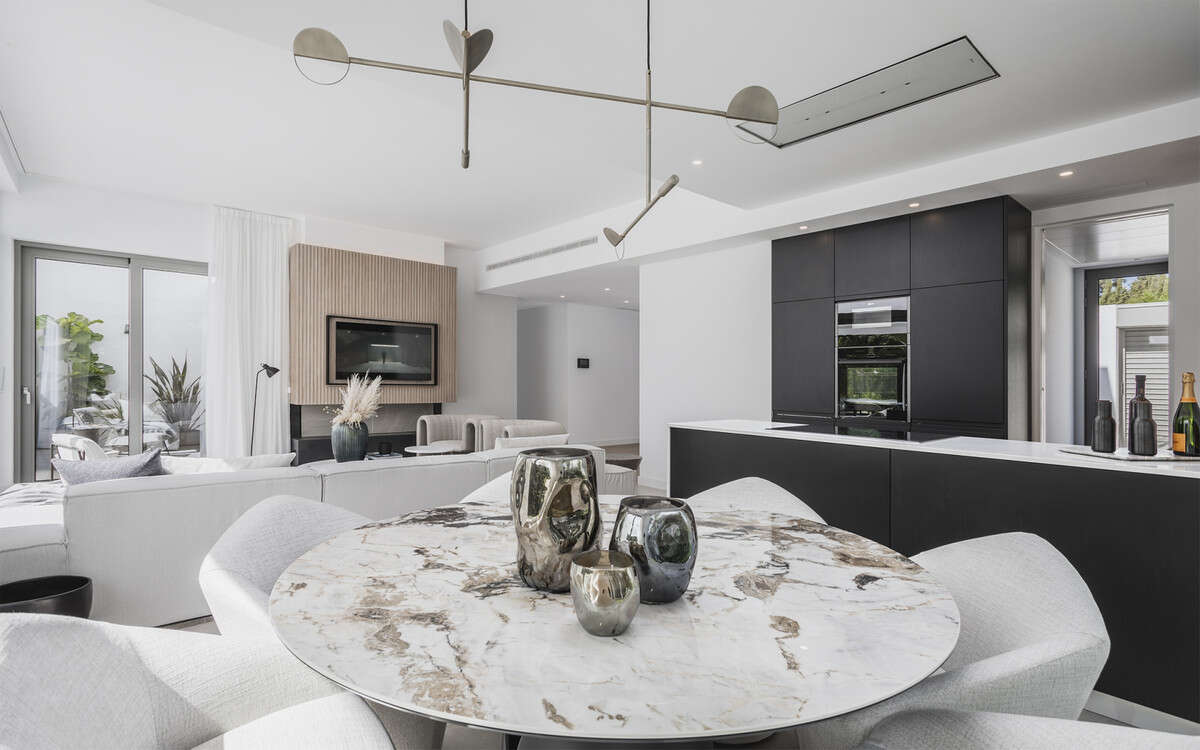 The open-plan design of the ground floor seamlessly connects living and dining areas with a well-appointed kitchen, creating distinct yet interconnected spaces for cooking, dining, and relaxation.