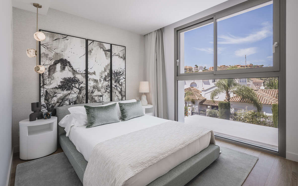 The upper floor extends the luxury with additional bedrooms, each featuring a private bathroom and direct access to a terrace.