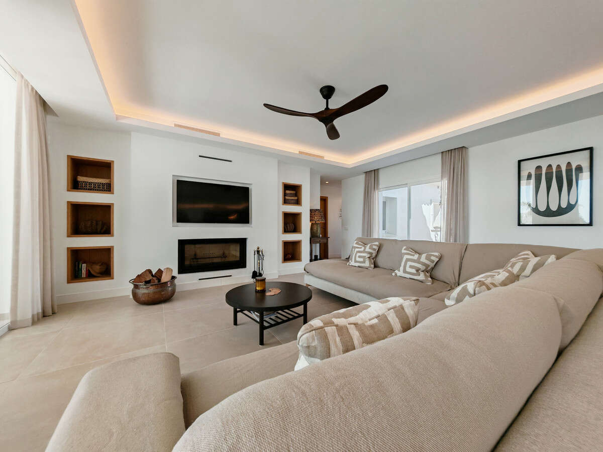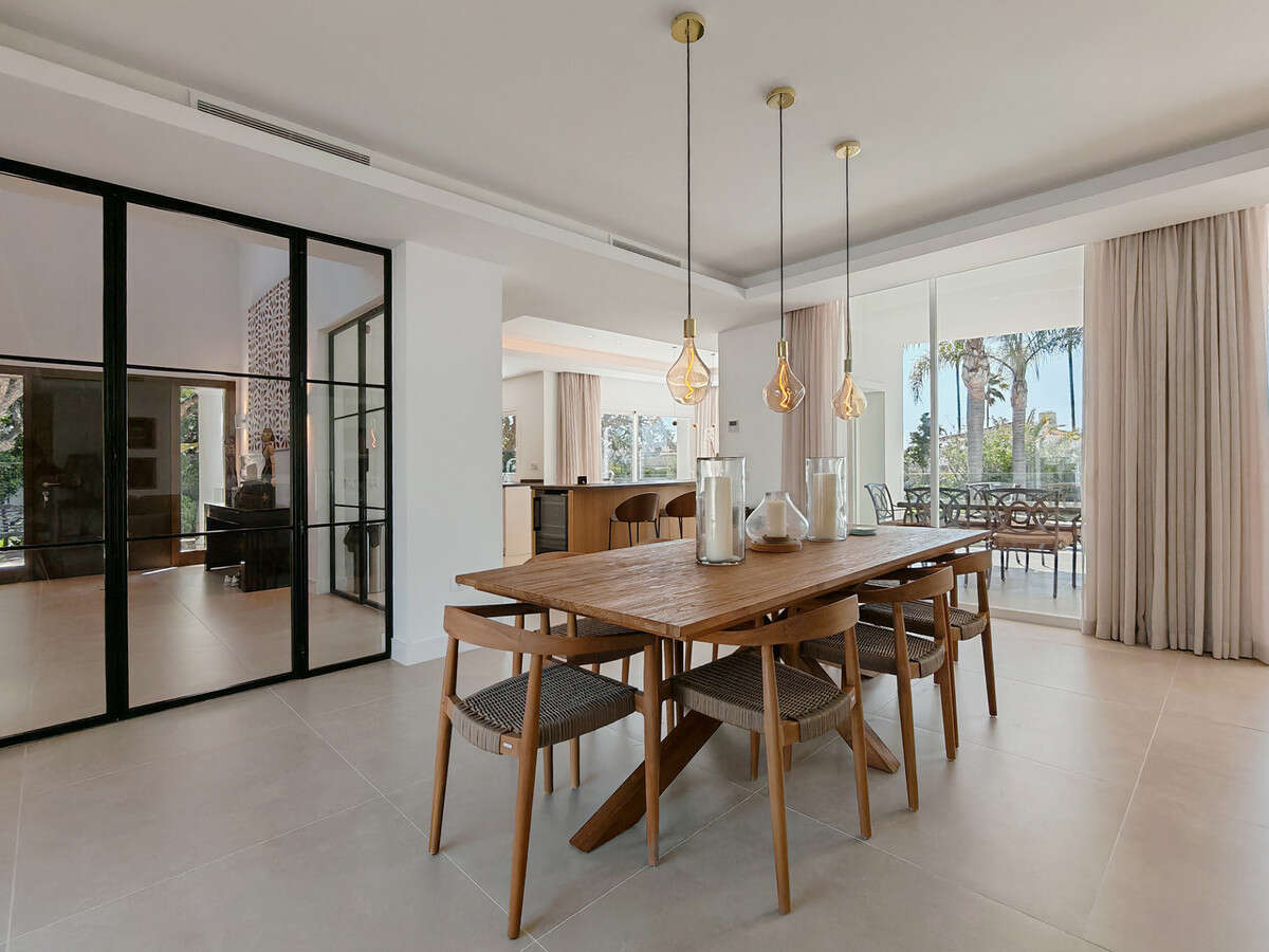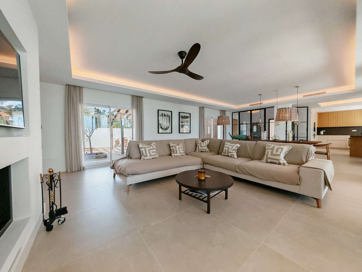 Villa for sale in Elviria, Marbella with 4 bedrooms, 4 bathrooms, 4 en suite bathrooms, 1 toilet and with orientation south, with private swimming pool, private garage and private garden. Regarding property dimensions, it has 327 m² built and 1,519 m² plot. Has the following facilities amenities near, transport near, air conditioning, central heating, fully fitted kitchen, utility room, fireplace, gym, alarm, guest toilet, private terrace, kitchen equipped, country view, mountain view, heated pool, automatic irrigation system, smart home system, laundry room, internet - wi-fi, fitted wardrobes, garden view, close to sea / beach, glass doors, excellent condition, recently renovated / refurbished, close to shops, close to town, close to schools, surveillance cameras, office room and partial sea views.