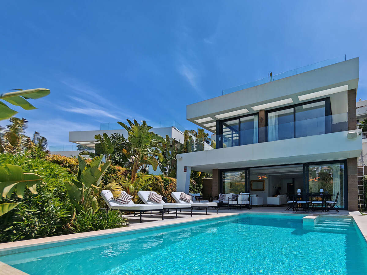 Villa for sale in La Resina Golf, Estepona with 5 bedrooms, 4 bathrooms, 1 on suite bathroom and with orientation west, with private swimming pool, carport garage (2 parking spaces) and private garden. Regarding property dimensions, it has 308.46 m² built, 521.21 m² plot, 308.46 m² interior and 95 m² terrace. Has the following facilities front line golf, air conditioning, fully furnished, fully fitted kitchen, utility room, fireplace, jacuzzi, basement, guest room, storage room, gym, alarm, solarium, security entrance, double glazing, video entrance, brand new, dining room, barbecue, security service 24h, guest toilet, private terrace, kitchen equipped, living room, study room, mountain view, golf view, heated pool, automatic irrigation system, smart home system, dolby stereo surround system, laundry room, internet - wi-fi, covered terrace, fitted wardrobes, garden view, pool view, panoramic view, cinema room, underfloor heating (bathrooms), wine cellar, close to children playground, close to sea / beach, close to golf, uncovered terrace, games room, glass doors, separate dining room, open plan kitchen, balcony, ceiling cooling system, close to schools, guest apartment, inside golf resort, office room and pets allowed.