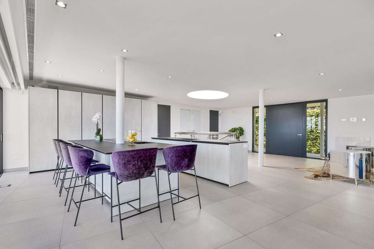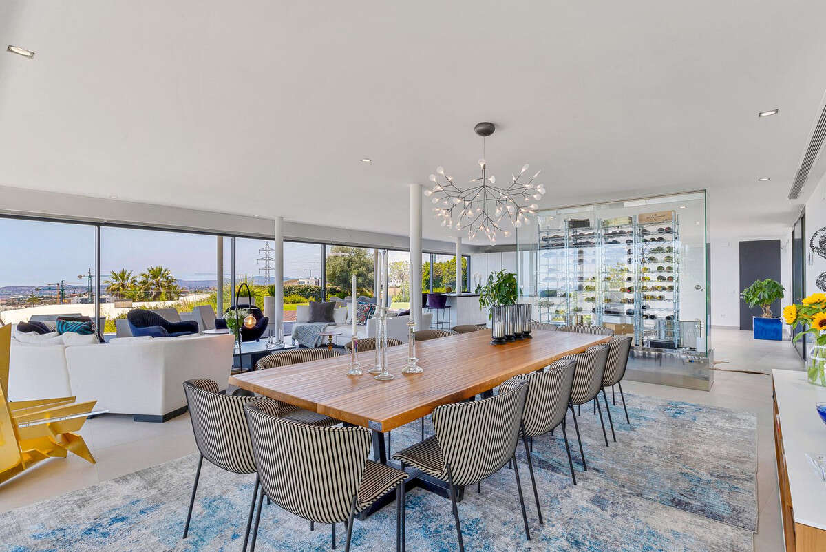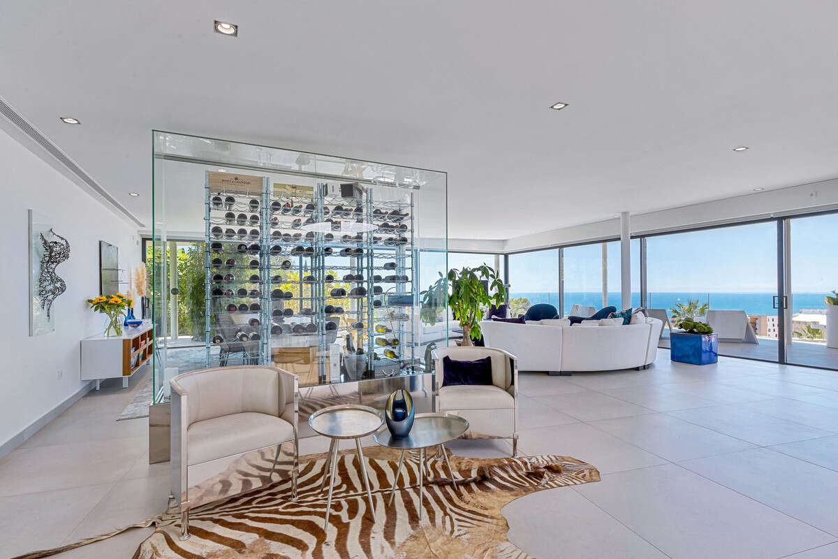 Contemporary designer villa with breathtaking views towards the sea. The villa comprises of two floors with main entrance on the upper level. From the moment you step through the front door, you are struck by the fantastic view thanks to the floor-to-ceiling glass doors along the whole front side of the house. The upper floor is characterized by an open floor plan that houses a kitchen island, integrated kitchen cabinets, dining area and sofa group. In the middle sits a glass wine cabinet. On this floor is also the master bedroom with bathroom en-suite and private dressing room. Outside the large glass doors is a lovely covered terrace that leads out to a wooden deck and lawn. From the wooden deck, a three-meter-wide staircase leads down to the 67 m2 pool with Jacuzzi. The villa´s two floors are connected by the specially designed staircase, which is the jewel of the house. On the lower level there are four bedrooms, each with an en-suite bathroom with glass walls, a guest toilet, a TV-room with a small kitchen and a fireplace, a laundry room and a large double garage. Three of the four bedrooms and the TV-room have access to the wooden deck next to the pool where, in addition to space for sun loungers and a dining table, there is an outdoor kitchen, barbecue and toilet, all protected by roll-up canvas roofs. The villa is equipped with air conditioning, under floor heating, alarms, security cameras, home automation, etc. The villa is located on one of the best plots in the exclusive Reserva del Higueron urbanization on the border between Fuengirola and Benalmadena only 15 minutes from Malaga International Airport. In the area there is the 5-star Hotel Hilton, sports club with gym, spa, padel and tennis courts and a Michelin restaurant.
