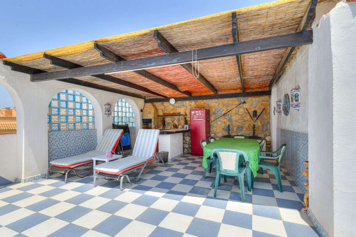 The property offers generous living space with a total of 123 sqm. In the main house, you will find two spacious bedrooms, two bathrooms, and a bright, well-equipped kitchen with ample space for cooking. Integrated appliances include an oven, microwave, fridge/freezer, dish washer, washing machine, and a gas hob. The room currently used as a dining area was previously a third bedroom.