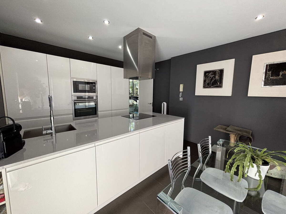 The open-plan living area connects to a modern kitchen and opens out to sunny terraces, a landscaped garden, and a private pool. On the rooftop, a large terrace provides panoramic views of the golf course and surrounding landscape — perfect for relaxing or entertaining.
