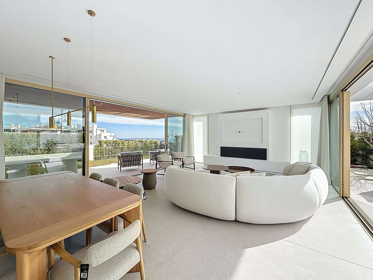The main floor includes the living–dining area, the fully equipped kitchen with Bosch appliances, one en-suite bedroom, and direct access to two terraces and the pool area.