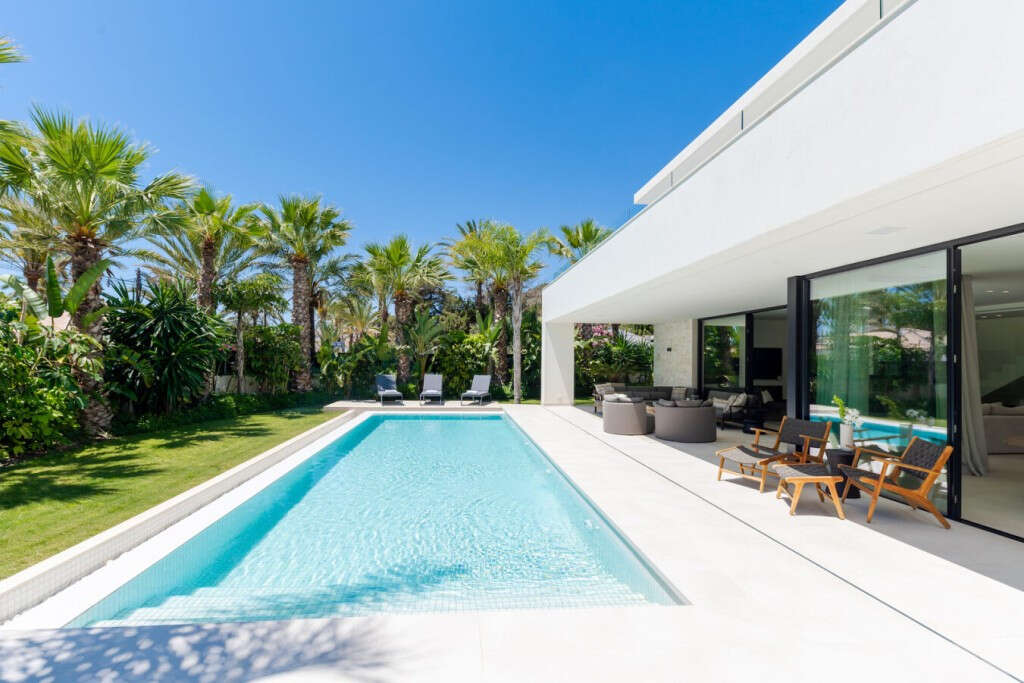 Built to a very high standard this contemporary luxury villa is strategically located near Elviria. Set on 3 levels and over 500m2 built located on a corner plot just 50 meters from the beach and a minutes walk to 5 beach restaurants. The home is exquisitely decorated with carefully chosen designer interiors, warm fabrics, wooden features & mature gardens