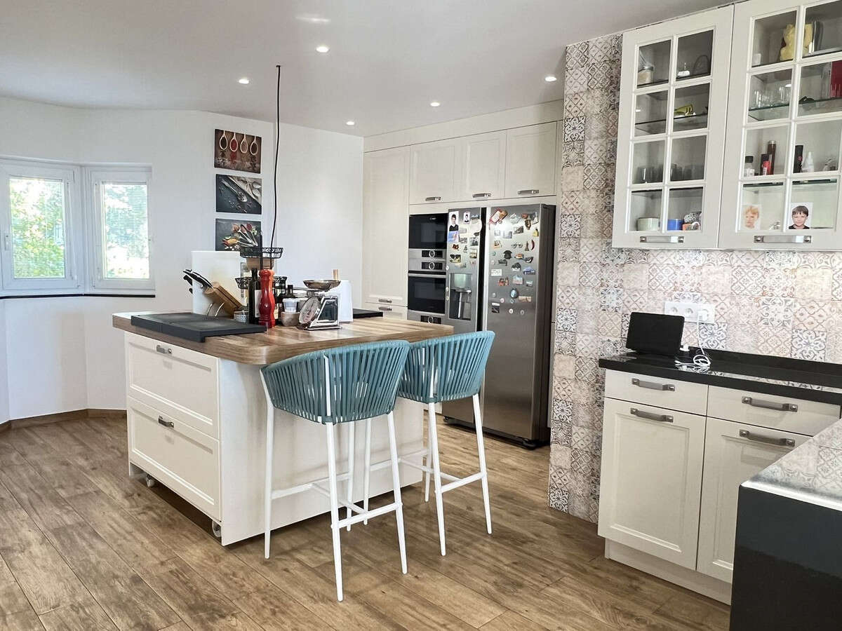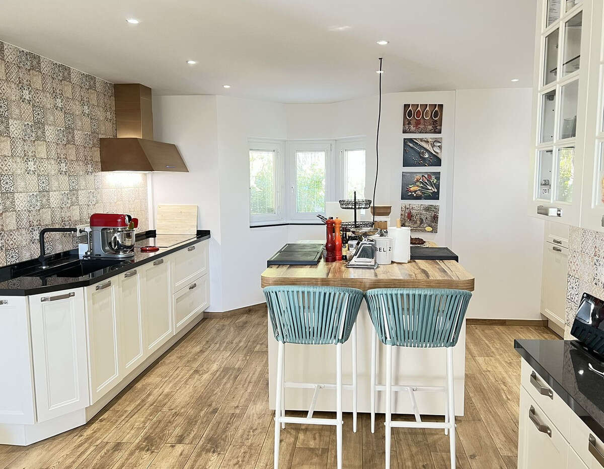 Large modern fully fitted kitchen with all modern cons including 3 different types of ovens, 5-plaque induction stove, bay-window and work island with breakfast bar.