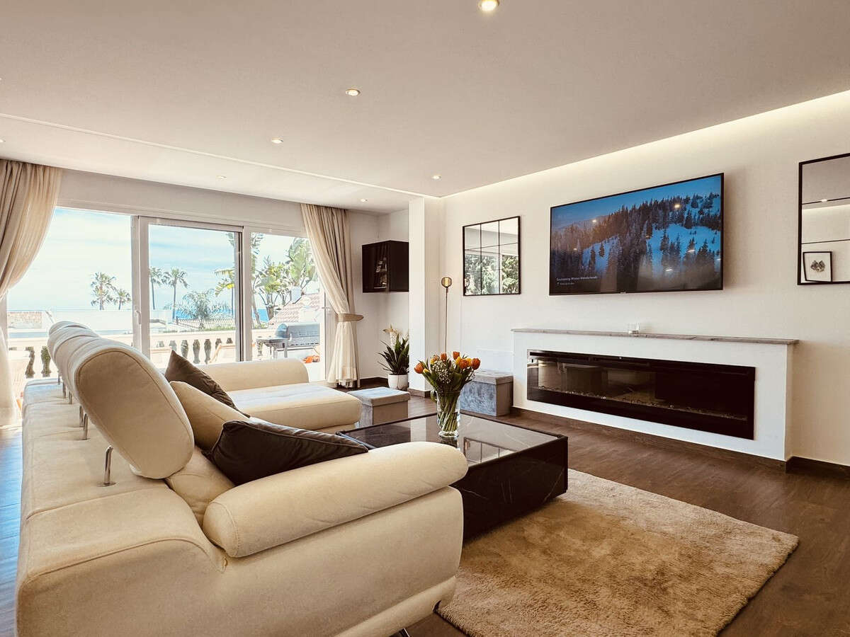 The open-plan living and dining room are bathed in natural light, enhanced by an electric fire for cozy evenings indoors. Access the expansive terrace from here, offering gorgeous sea views and all-day sunshine.