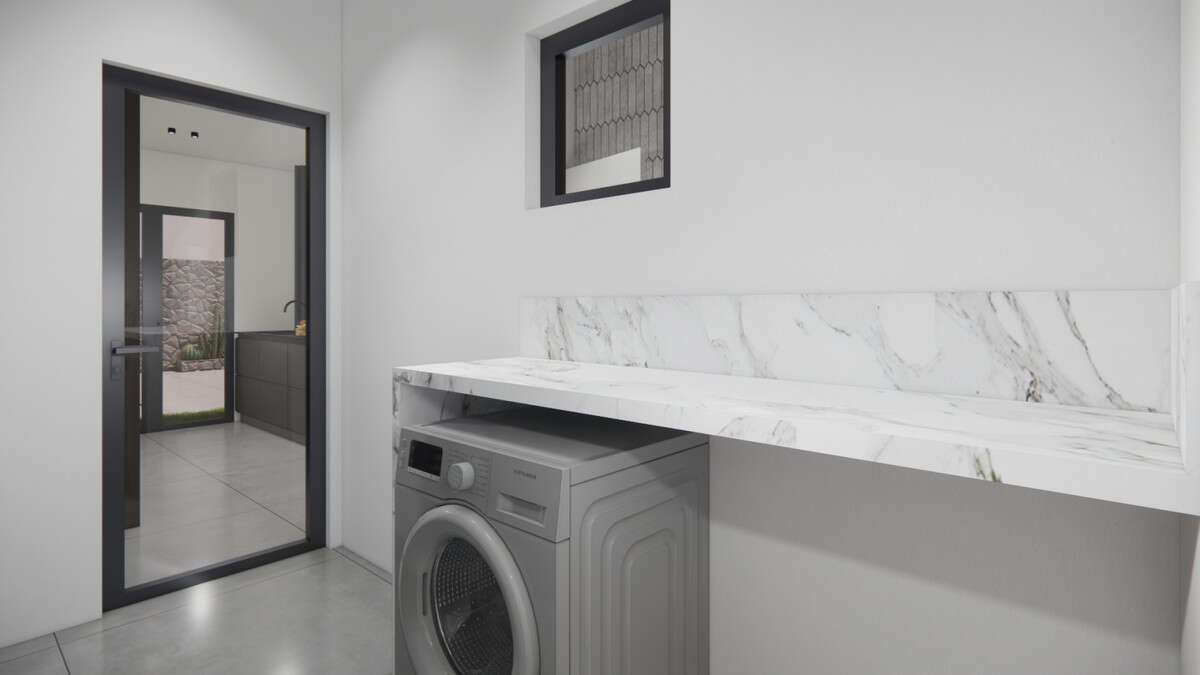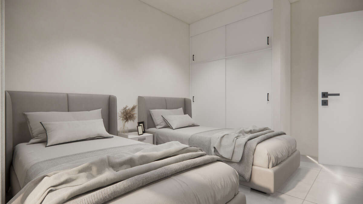Each villa offers 110 m² of living space, spread over two floors, designed to maximize natural light and generous outdoor spaces with a private pool, ideal for relaxing or entertaining. The ground floor comprises an open-plan living area with an integrated kitchen, a bedroom, bathroom, and laundry room, while the upper floor offers two en-suite bedrooms and access to a private terrace.