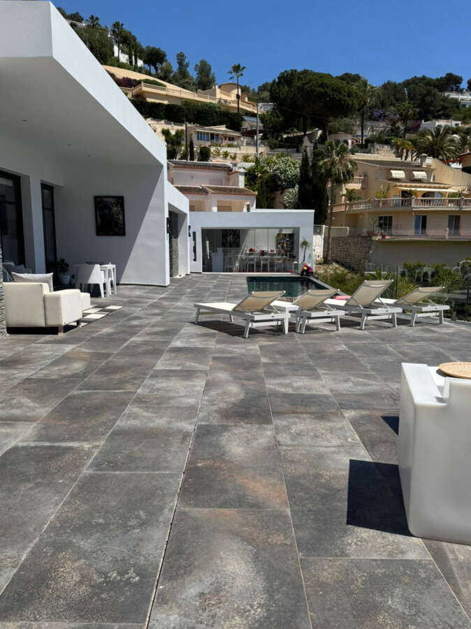 The beautifully landscaped garden showcases mature Mediterranean flora, including majestic palms, flourishing bougainvilleas, and ancient olive trees. Every detail has been thoughtfully curated to create a serene and harmonious outdoor haven.