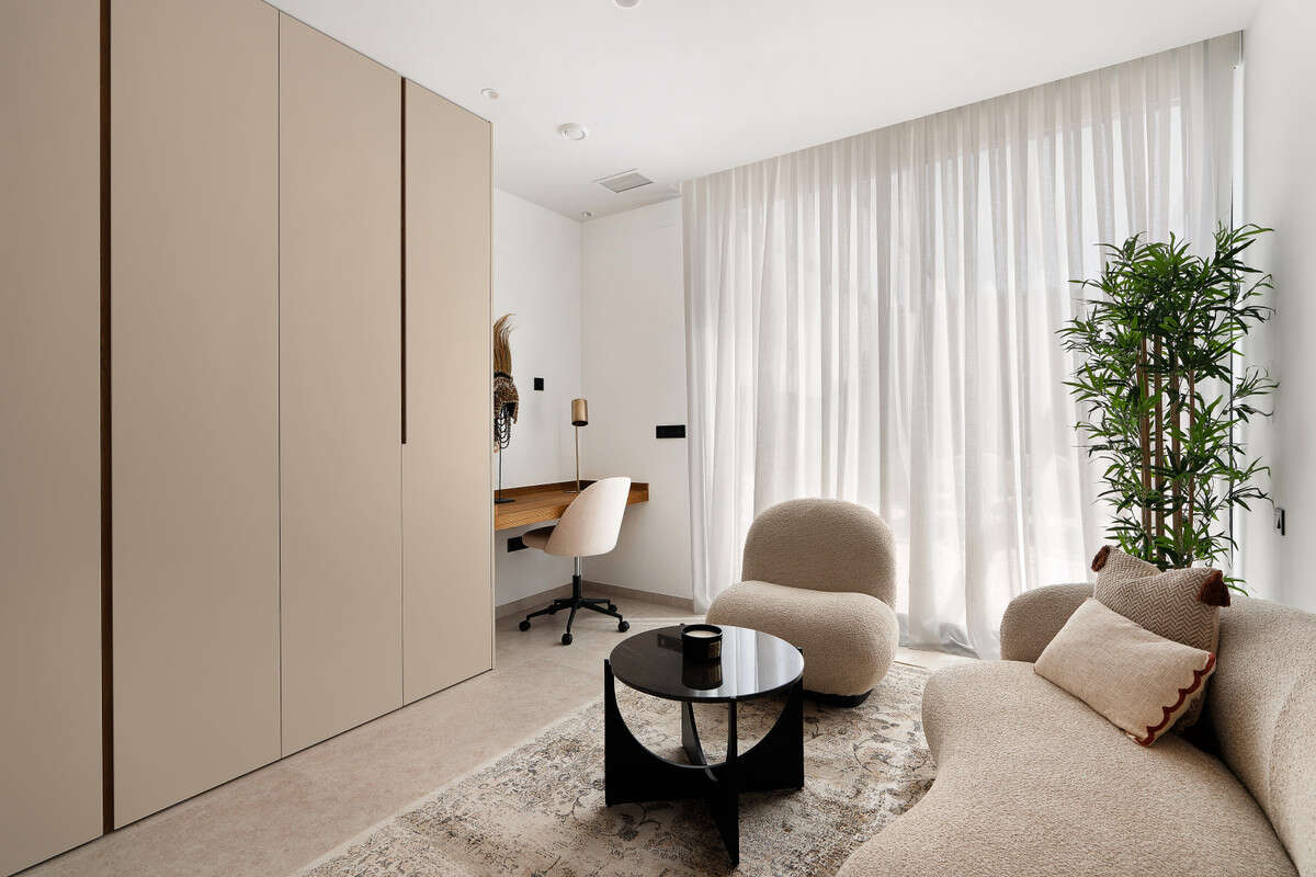The semi-basement floor has independent access from the plot. It has an interior garden that provides natural light and cross ventilation, as well as a laundry and ironing room to where the laundry duct descends. There is the possibility of enabling a guest apartment in the basement. Additionally, each villa is equipped with a charging station for electric vehicles. With a 481 m² plot, south and east orientation, and energy class A, this property is not only spacious and modern, but also energy efficient.