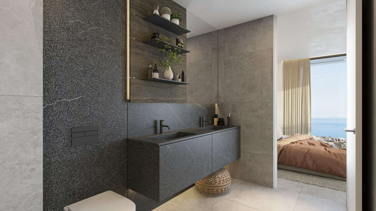 Inside, the home is defined by clean architectural lines and a seamless integration of light and space. Floor-to-ceiling windows frame the surrounding natural beauty while allowing abundant sunlight to cascade into the open-plan living and dining areas. The kitchen — a Moldunova design — is included in the sale and features an ultra-modern aesthetic with high-end finishes, ready for personalisation. The bathrooms are equally refined, enhanced by premium Ritmonio taps, combining functional excellence with Italian design.