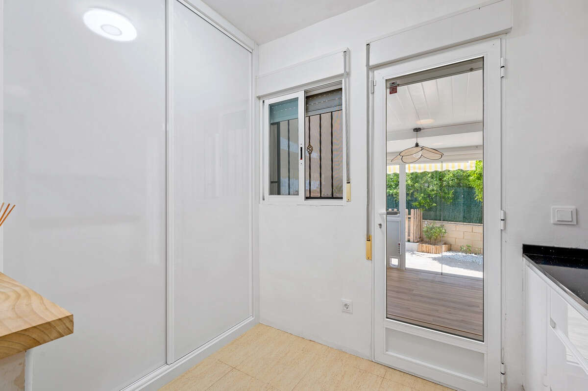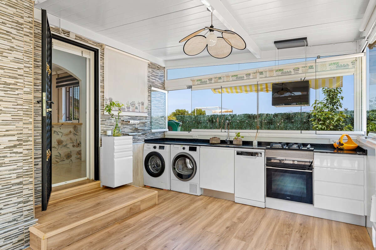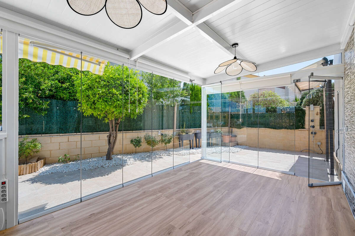 Outdoor areaThe villa has a charing garden with a glazed terrace in front. In the front garden you can also find a covered parking space, which is currently being used as a seating area. On the side of the house you can find a storage room. There is another glazed terrace in the back garden, and in this part of the garden you can also find an outdoor shower and space for another seating area. In the first floor there is a terrace with sea views.